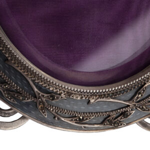 An oval silver frame decorated with translucent blue guilloche enamel and applied foliate ornament in relief. The border features a repeating pattern of intertwined leaves with beaded edging, with small cut diamonds incrustations in casts.
