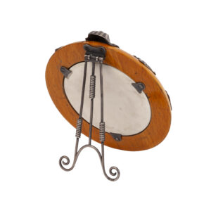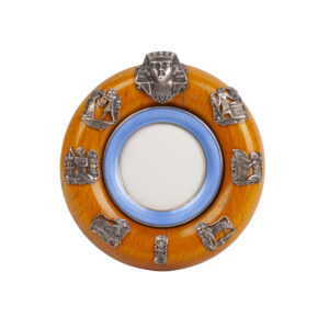 A circular photo frame made of Karelian birch with silver mounts depicting figures and ornamental motifs, referred to Egyptian art. The photograph opening is surrounded by a border of sky-blue guilloché enamel, lending the piece a vivid decorative accent. The interplay of warm wood, cool silver, and vibrant enamel reflects the stylistic tendencies of Russian Art Nouveau in the early 20th century.