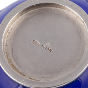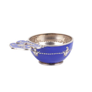 A refined silver-gilt kovsh, its body cloaked in a deep opaque blue enamel, accented with applied silver ornament and bead motifs. Its shaped handle is richly modeled with scrollwork and bears a cabochon accent, uniting traditional Russian form with decorative finesse.