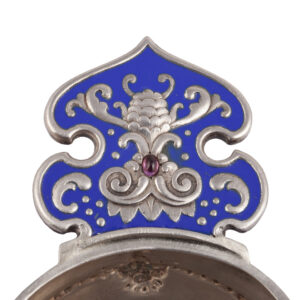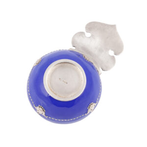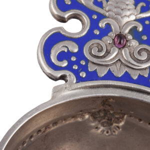 The kovsh, historically a Russian ladle-like vessel, was revived in late 19th-century decorative arts as a symbol of national identity. Fabergé’s Moscow workshops elevated the form by combining classical silhouettes with high-quality enameling and luxurious silver detailing.