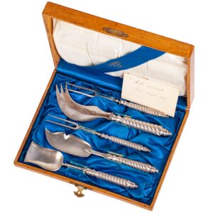 An interesting Russian silver-gilt set for delicacies, preserved in its original fitted case with silk and satin lining. The set comprises a caviar trowel, caviar knife, cheese knife, and two snail forks, each with spiral-twist handles. Marked HG, St. Petersburg, late 19th century.