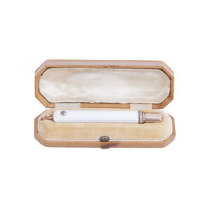 Alexander Väkevä (Wiakeva) – Son of St. Petersburg goldsmith Stephan Wiakeva, Alexander continued the family workshop after his father’s death, working alongside his brother Konstantin (1867–1902). The Wiakevas collaborated closely with the firm of Carl Fabergé, and their objects often bear Fabergé marks and inventory numbers. Their work is noted for refined craftsmanship in gold and enamel, contributing to the celebrated output of the Fabergé enterprise.Dimensions of the pencil holder: 9.2 x 1.1 x 0.7 cm. Dimensions of the box: 2.8 x 3.6 x 10.6 cm.