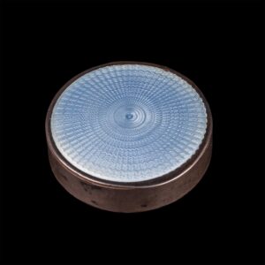 Dimensions: 4.0 × 1.1 cm Weight: 26.5 gOf circular form, enameled in translucent sky blue over guilloché ground, the hinged lid and border finely detailed with engraved ornament. The refined execution exemplify Wigström’s workshop under the House of Fabergé during the firm’s final Imperial years.