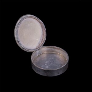 Height: 3.5 cm.A circular silver bonbonnière with a hinged cover decorated in polychrome enamel. The lid shows a stylized deer within a geometric border of grapes and foliage, rendered in a manner that reflects the Stroganov School’s search for a distinctly national style. The design draws inspiration from ancient Russian and folk art motifs, reinterpreted through art-nouveau style opaque enamel techniques.