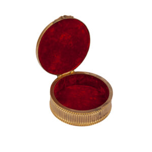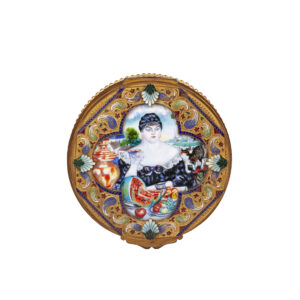 This circular bonbonnière is decorated with a en plein enamel miniature after Boris Kustodiev’s celebrated painting Merchant’s Wife at Tea. The image of the stately beauty at a richly laid tea table, surrounded by fruit and a samovar, became one of the iconic motifs of the Russian Revival in early 20th-century art. The miniature is framed by elaborate cloisonné enamel ornament with stylized floral motifs, characteristic of the Stroganov workshops.