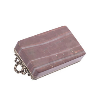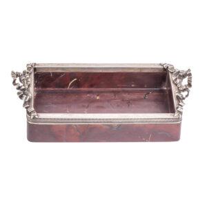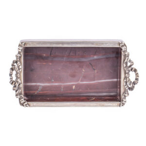 A finely worked rectangular tray combining the deep tones of polished jasper with a refined silver rim, ornamented with ribbon-tied swags.