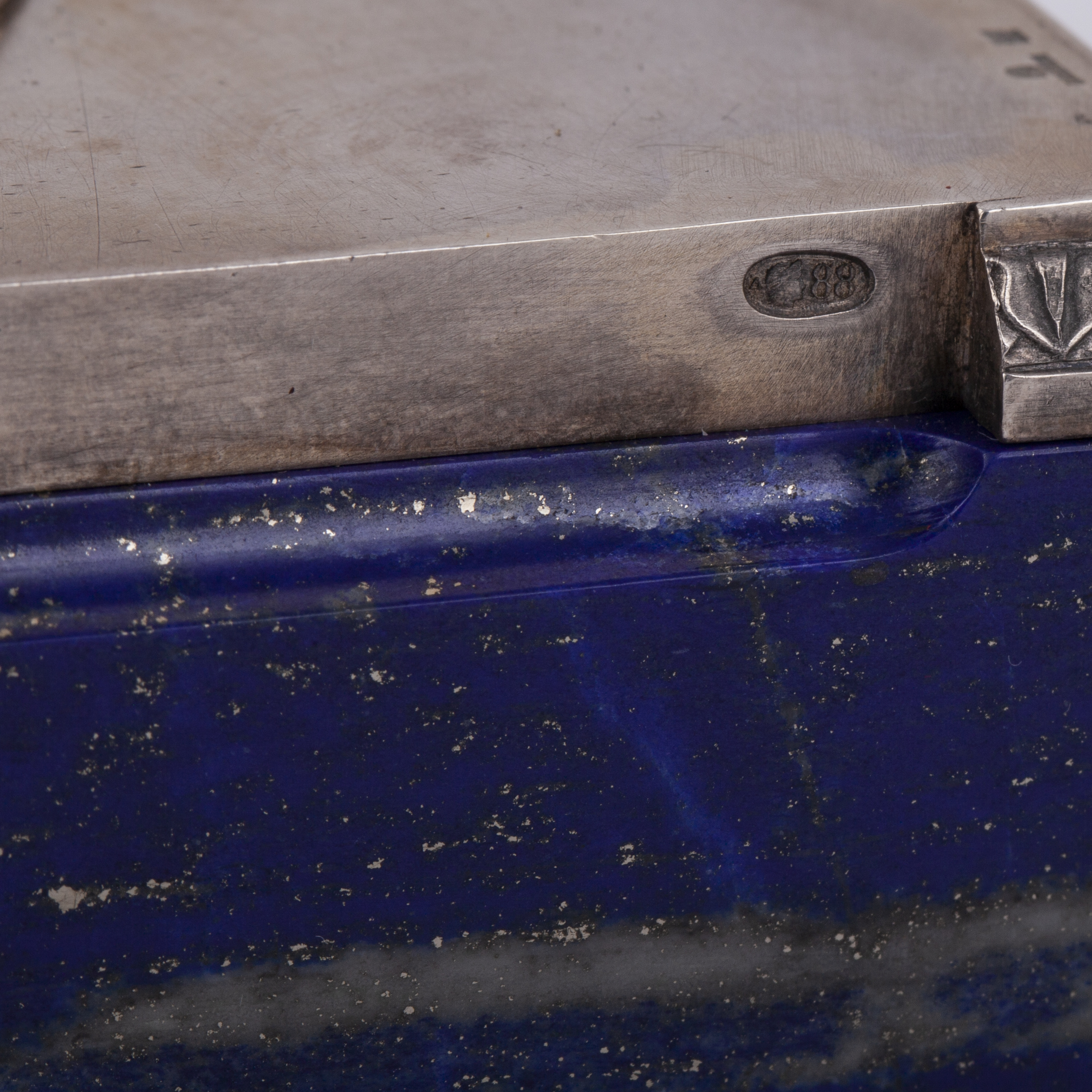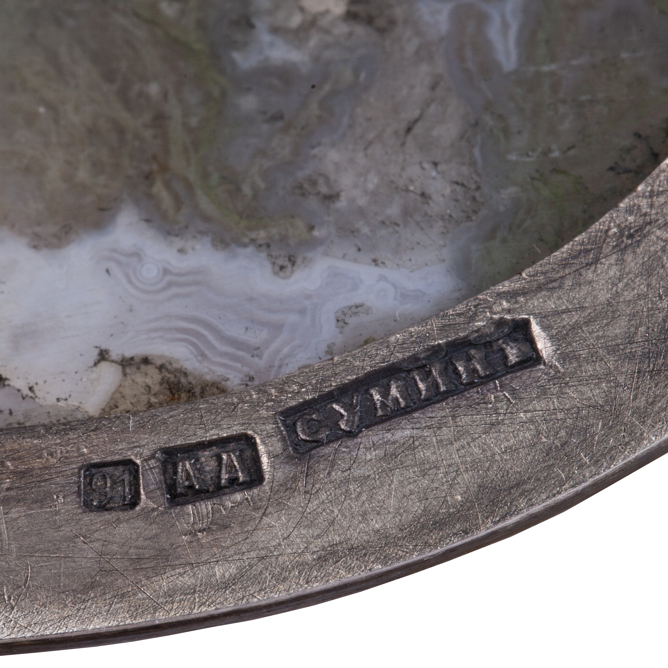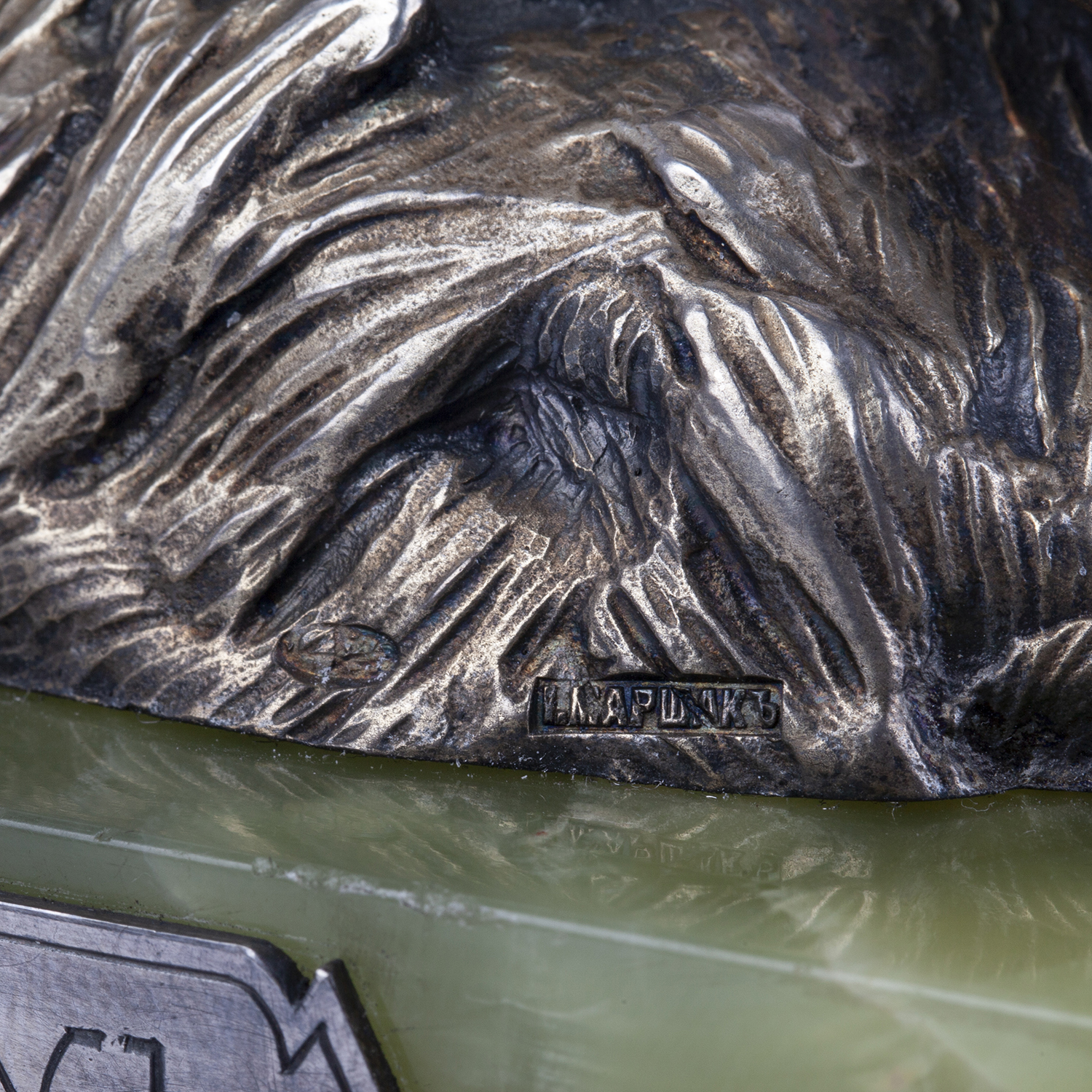 . Silver, casting, chasing, white material, jasper. Makers mark of M. Ovchinnikov with the Imperial warrant. Petersburg, 1908-1917.