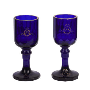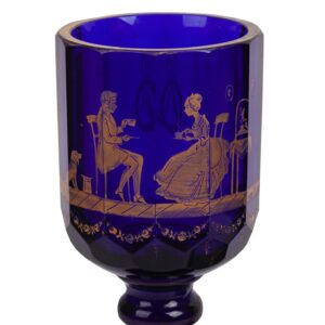 A pair of faceted cobalt blue goblets decorated with gilded genre scenes depicting children at play and courting couples. One goblet features children playing cerceau — a hoop game that originated in France under Louis XIV. According to legend, the game symbolized devotion: a marquis caught his wife’s thrown ring on his sword, winning back her favor. The pastime became fashionable among the Russian nobility, especially among women and children, and represented grace and agility.