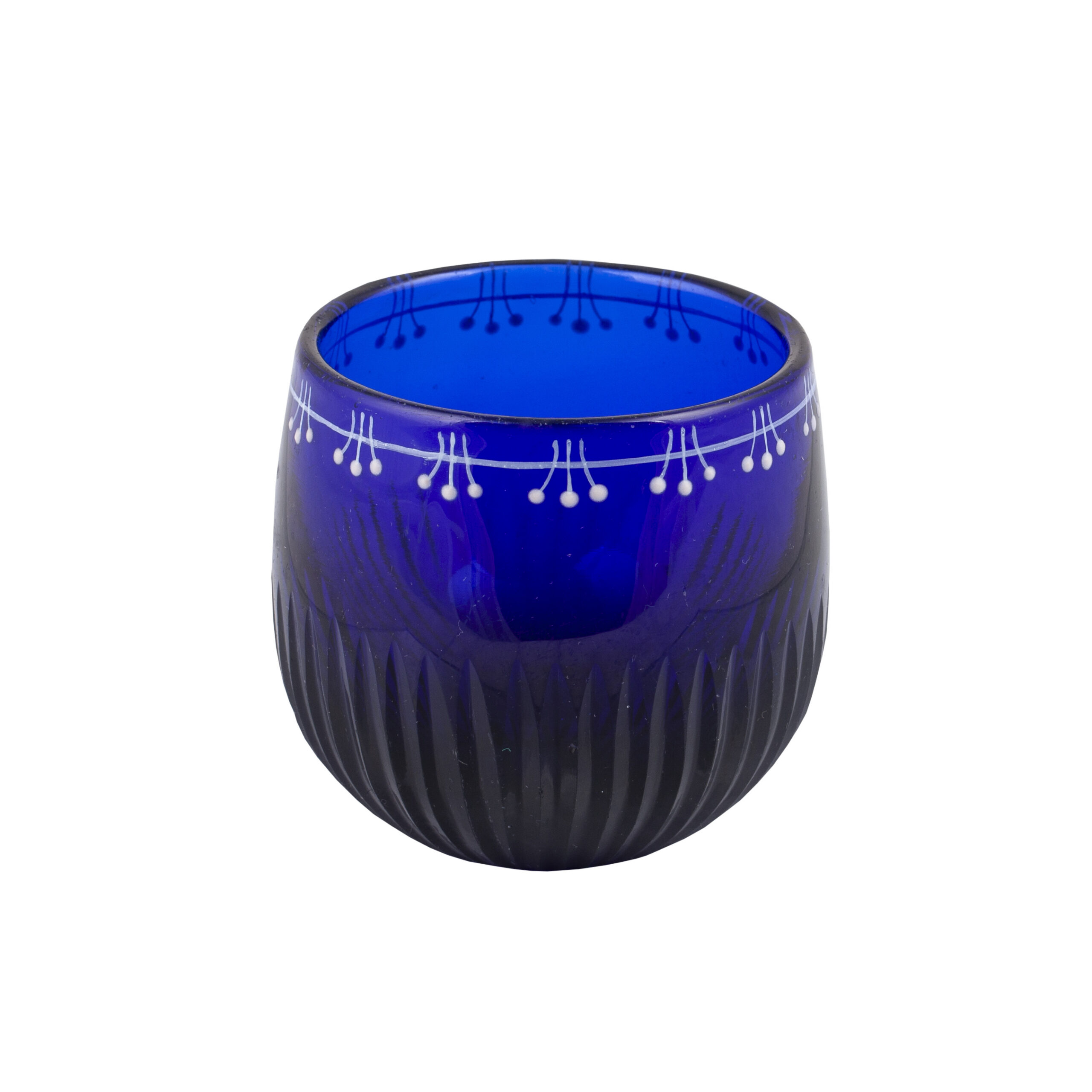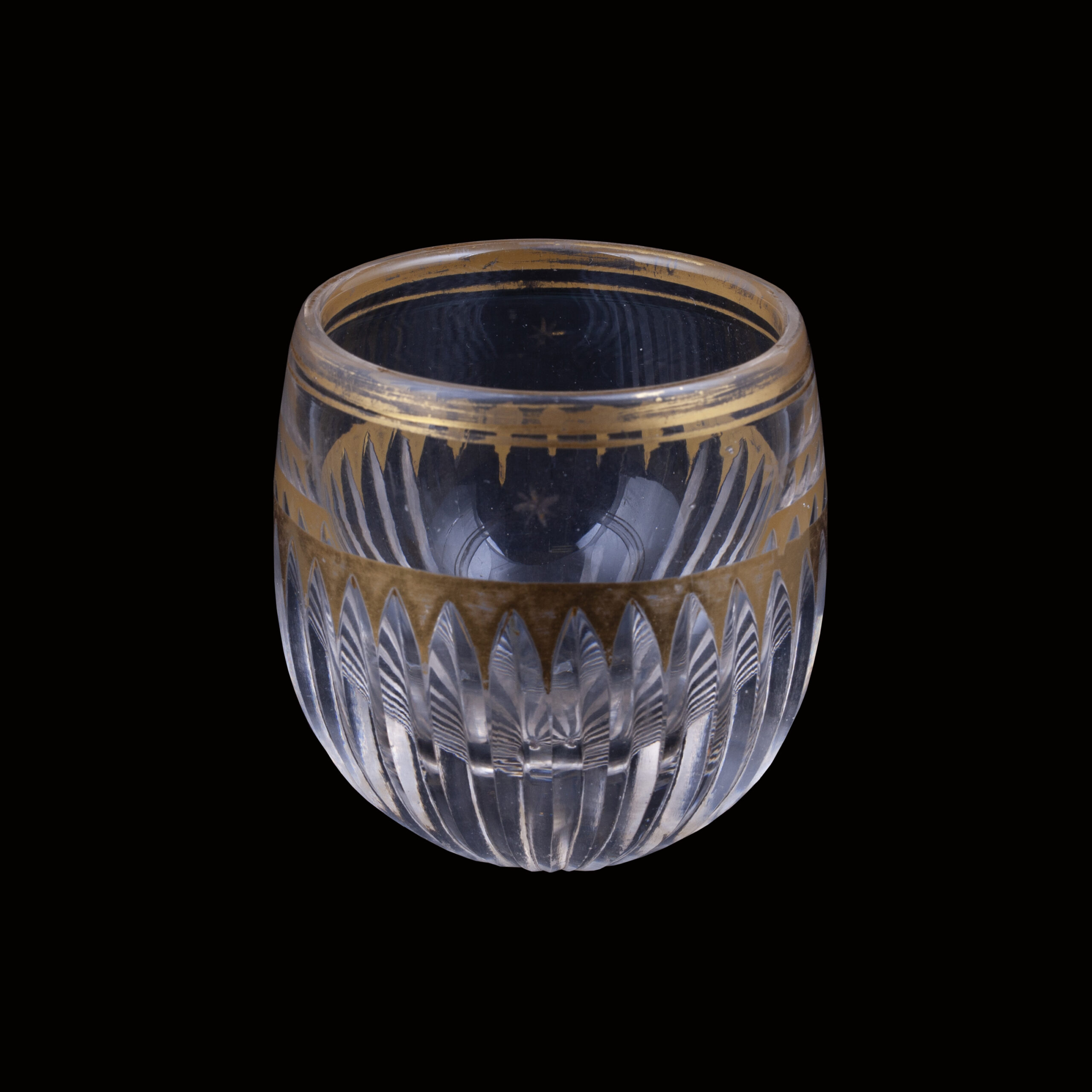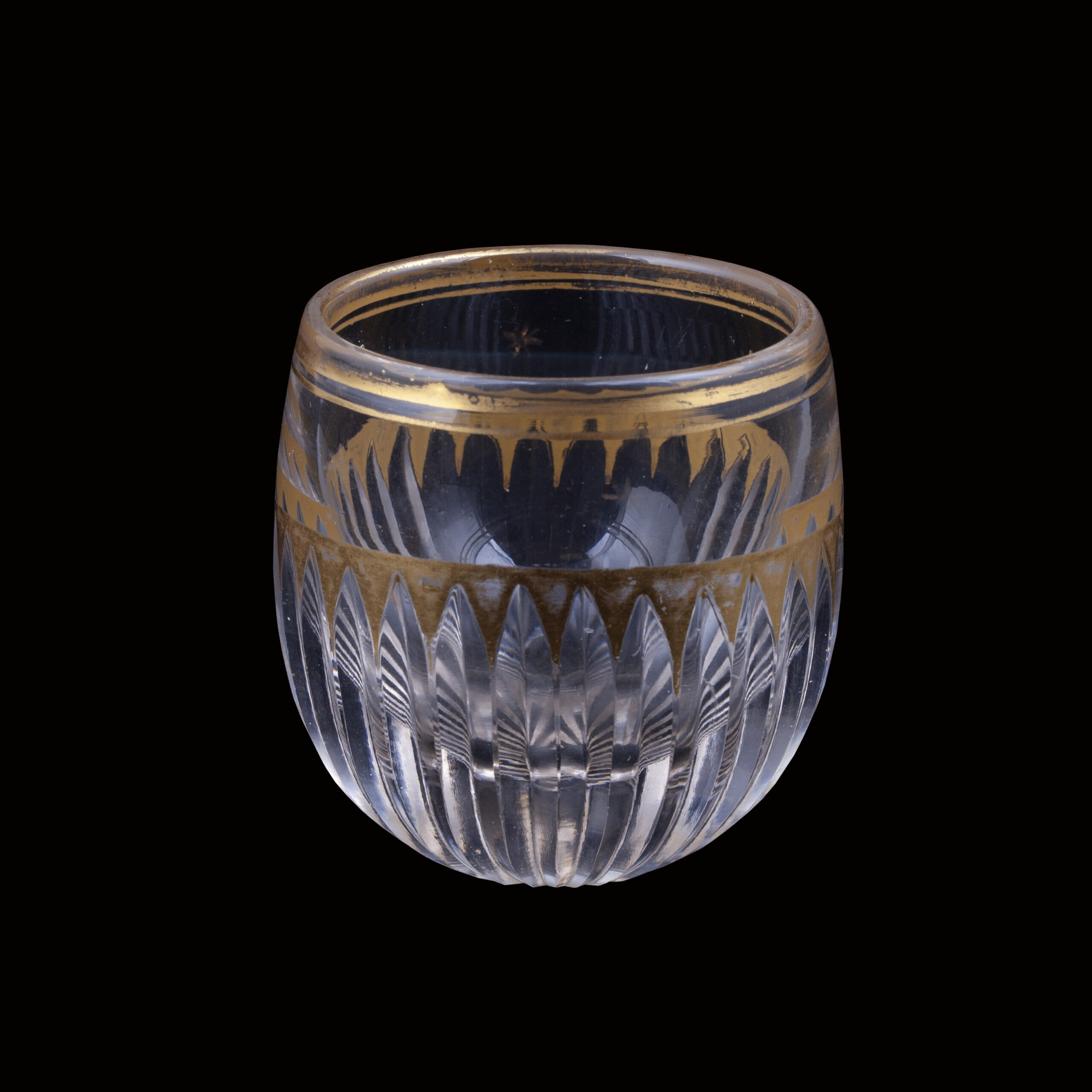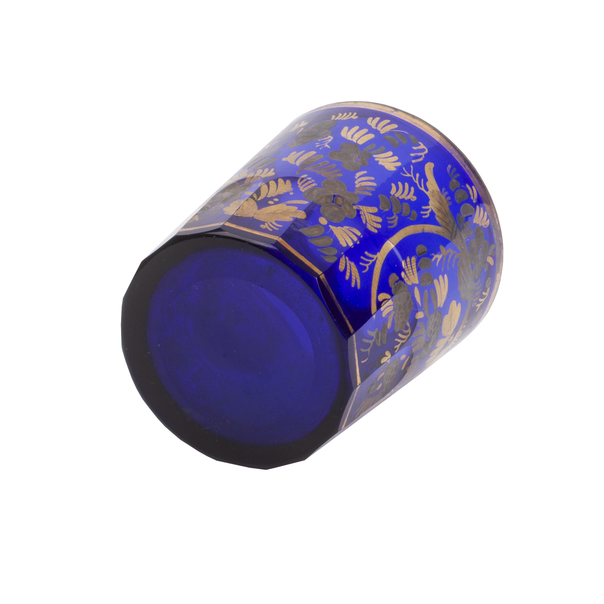 Transparent turquoise-blue glass; gilding and polychrome enamel.