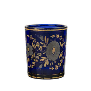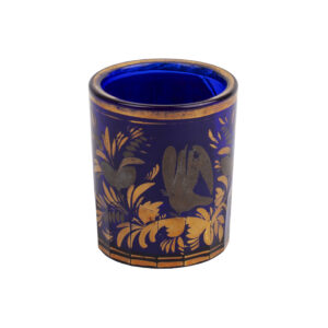 A rounded vodka tumbler known as “Nevaliashka” (“roly-poly”), made of deep cobalt-blue glass with cut decoration and a delicate white enamel border.