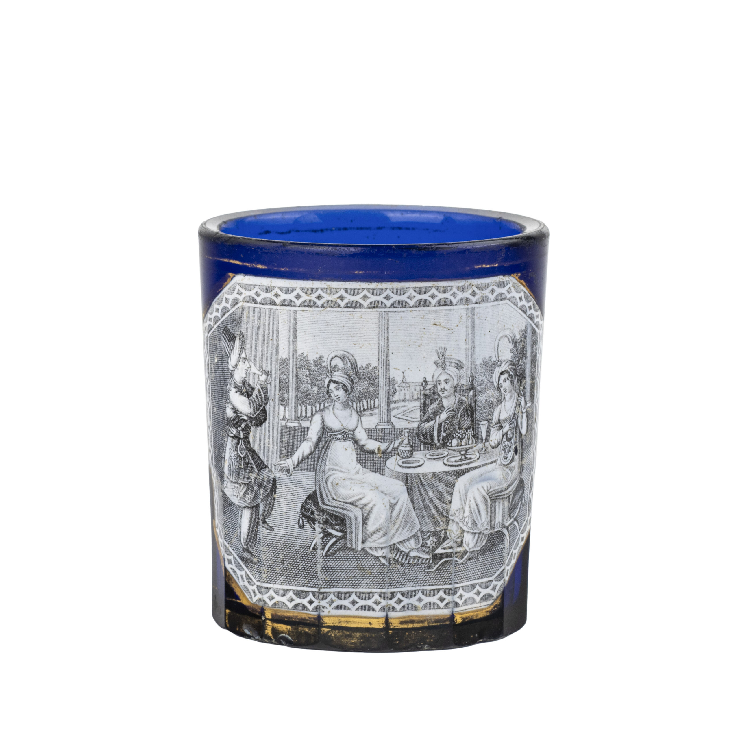 This work exemplifies the lithographic decoration developed by the Terebenev and Semechkin workshop, which specialized in applying portraits of members of the Imperial family to glass, porcelain, and faience objects in combination with gilded ornamentation.
