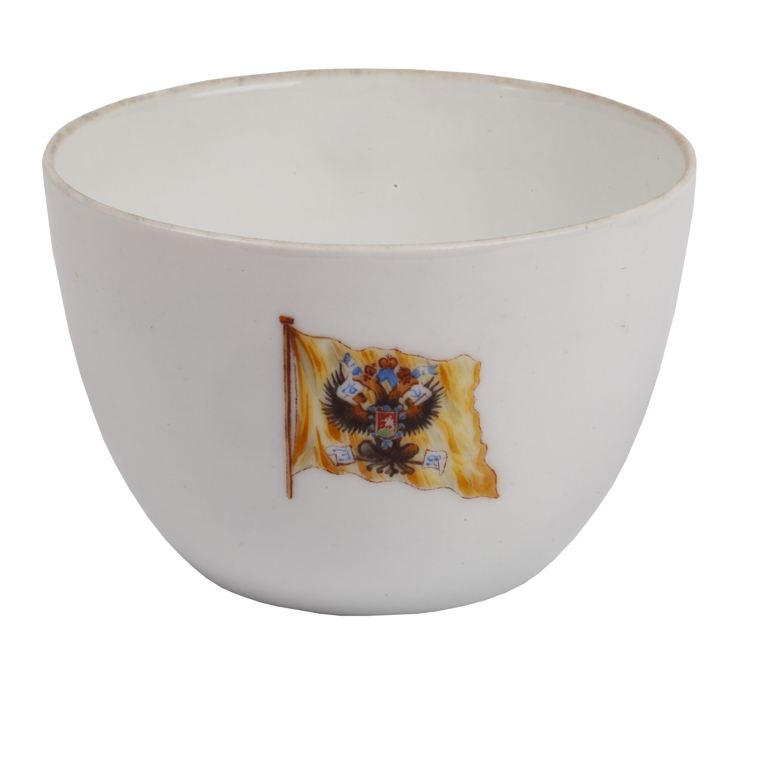 The glass is adorned with a well-known printed image of Empress Alexandra Feodorovna, after the painted original by artist P. I. Razumihin (1812–1848), from the collection of the State Historical Museum. The portrait is framed by a wreath of oak and laurel leaves. Below is the double-headed eagle with scepter and orb; above the garland rises the imperial crown. Oak branches extend to the sides, flanked by four banners on either side of the wreath.