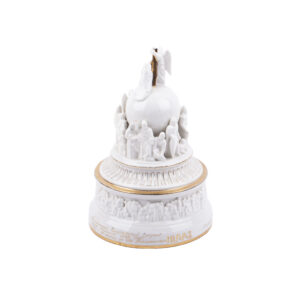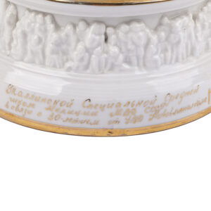 A Russian porcelain figure modeled after the famous monument Millennium of Russia in the city of Novgorod. The inscription on the base reads: Tallinn Special Secondary Police School of the Ministry of Internal Affairs of the USSR, in honor of the 30th anniversary of the Internal Affairs Directorate of the Executive Committee. November 30, 1974. Maker’s mark: Bronnitsi Manufactory (Proletary factory).