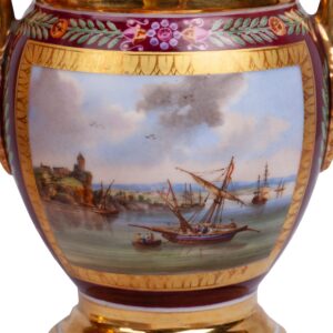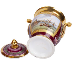 This elegant ensemble is richly decorated in deep burgundy and gold tones, with finely painted landscape scenes depicting coastal views of Feodosia — ships in the harbor, fortress walls, and seaside architecture. Each panel is framed by gilded borders, while the upper sections of the vessels are adorned with floral garlands and neoclassical ornaments in vibrant enamels. The interiors and handles are fully gilded, reflecting the luxurious character of Russian porcelain of the period.