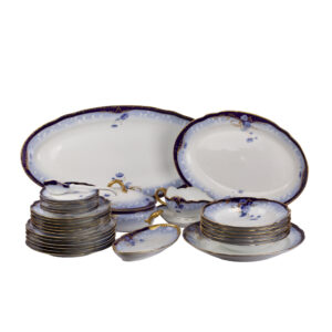 A Russian porcelain dining service of 30 pieces, richly decorated with cobalt-blue and gold floral painting.