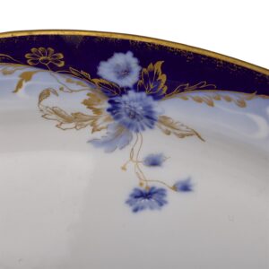 The service includes plates of various sizes, serving platters, sauce boats, and bowls, all unified by a refined design featuring delicate hand-painted blue flowers and gilded foliage on a white ground. The rims are bordered with a deep cobalt band, enhanced by gold scrolls and accents, creating a striking contrast and sense of depth.