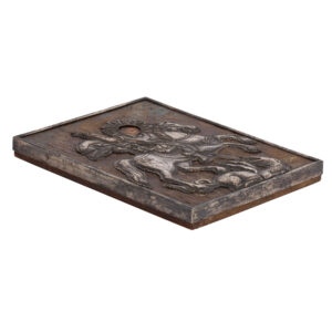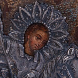 This finely crafted Russian icon depicts Saint George the Victorious, one of the most revered warrior saints of the Orthodox Church, shown on horseback slaying the dragon — a timeless symbol of faith’s triumph over evil. The saint’s face and hands are delicately painted in oil, while the remainder of the composition is covered with a richly embossed silver riza (revetment).
