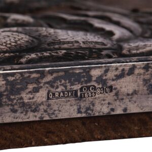 “To Feldfebel (Sergeant) of the 10th Company, 89th Belomorsky Infantry Regiment, Ivan Tapper, in remembrance from the Company Commander Captain Hidlevsky and the lower ranks of the company. City of Reval, 1900.” This memorial icon of Saint Nicholas the Wonderworker, one of the most venerated saints in Russia and patronical Saint of Russian army, is painted in oil on wood and enclosed in a finely crafted silver-gilt oklad (riza) and a wooden kiot (protective case). The oklad, made by the renowned Moscow silversmith Antip Kuzmichev, exemplifies the exquisite metalwork of late 19th-century Russia. Kuzmichev’s workshop, founded in 1856, was famous for its collaboration with the American firm Tiffany & Co., producing luxury silver and enamel objects for both Russian and international markets.The engraved dedication connects this icon to the 89th Belomorsky Infantry Regiment of His Imperial Highness the Heir Tsarevich, part of the Imperial Russian Army. The regiment, whose lineage dates back to the early 18th century, was awarded numerous honors for its bravery in major military campaigns.