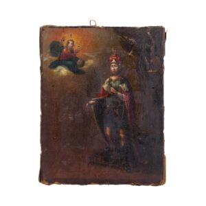 This elegant icondepicts Saint Prince Alexander Nevsky, one of the most venerated Russian military saints and a national hero. The saint is portrayed standing, dressed in princely armor and a cloak, his gaze turned heavenward toward Christ Pantocrator, who appears in the upper left blessing the prince.