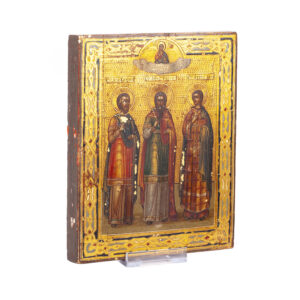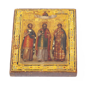 A finely painted Russian icon depicting the Holy Martyrs Gurias, Samonas, and Aviv, known as early Christian saints and patrons of faithful marriage. At the top, Christ Emmanuel appears in blessing, emphasizing the heavenly approval of the martyrs’ steadfast faith. Executed in the precise and elegant style typical of Russian provincial iconography of the late 19th century.