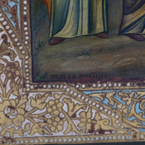 The inscription on the reverse confirms that this icon was created in the Mstyora Training and Icon-Painting Workshop, founded under the auspices of the Committee for the Guardianship of Russian Icon Painting (1901–1918). The Committee, established by Count Sergey Sheremetev with support from artist Viktor Vasnetsov, sought to revive traditional Russian iconography and preserve ancient tempera techniques in opposition to mass-produced printed icons.Dimensions: 31,3 x 26,4 x 2,6 cm.