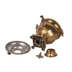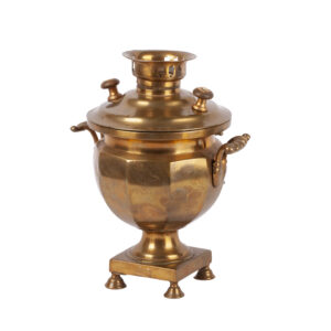 A rare miniature brass samovar known as an “Egoist”, designed for a single person and holding less than one litre. The body is shaped as a faceted cup with smooth walls, gracefully curved handles, and a square base with turned feet. Despite its modest size, the samovar retains all the classical proportions and decorative elegance typical of full-sized examples.