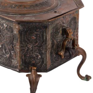 The body is pear-shaped with narrow vertical fluting. The domed lid, decorated with alternating wide and narrow ovals, merges seamlessly with a conical, pierced chimney. The spout and supports are richly ornamented with vegetal motifs, while the handles — composed of paired, upward-curving elements — imitate stylized plant stems. The baluster-shaped base rests on four circular feet, giving the piece a graceful silhouette.