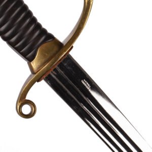 Very good example with crisp etchings, sharp blade edge, and strong markings throughout. Minor wear and light patina to hilt and scabbard consistent with age. All components appear original and matching.