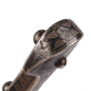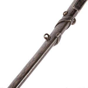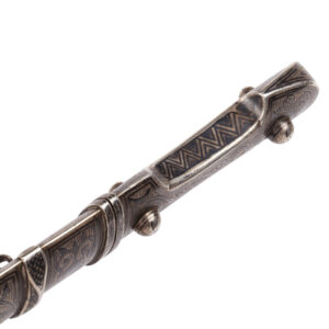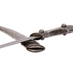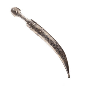 Rare Transcaucasian Bebut dagger from the late 19th century, crafted in the tradition of local armorers. The scabbard and hilt are lavishly decorated with silver niello work, characteristic of Caucasian decorative arts. The blade is forged from high-quality steel, showcasing the region’s master blacksmithing techniques.