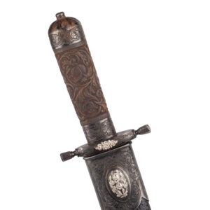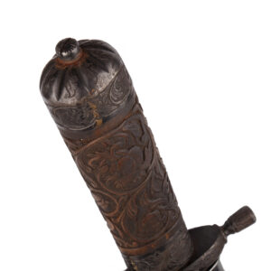 The broad single-edged blade, 23.6 cm in length, features a shallow fuller and retains traces of its original polish and etching. The hilt is fitted with a finely carved wooden grip decorated with floral scroll motifs, complemented by engraved steel mounts of rich ornamental character.
