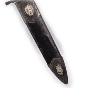 The scabbard is covered in black leather and fitted with etched steel mounts, decorated with vegetal scrolls and silver inlaid floral medallions in the traditional Tula niello style. The craftsmanship demonstrates the artistic excellence typical of mid-19th-century Tula production.