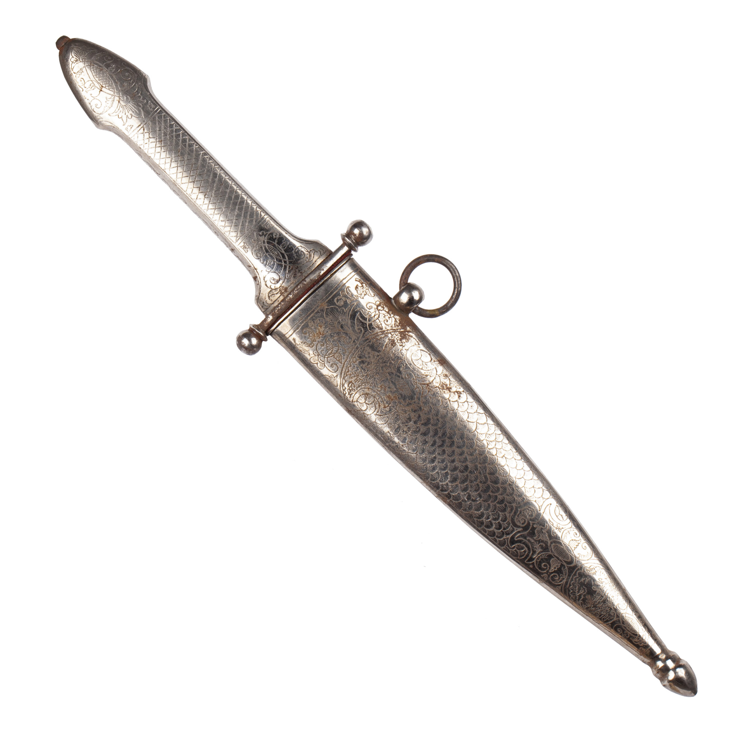 The dagger retains its scabbard with engraved metal fittings, enriched with floral designs and fine silver inlays, Zlatoust craftsmanship.