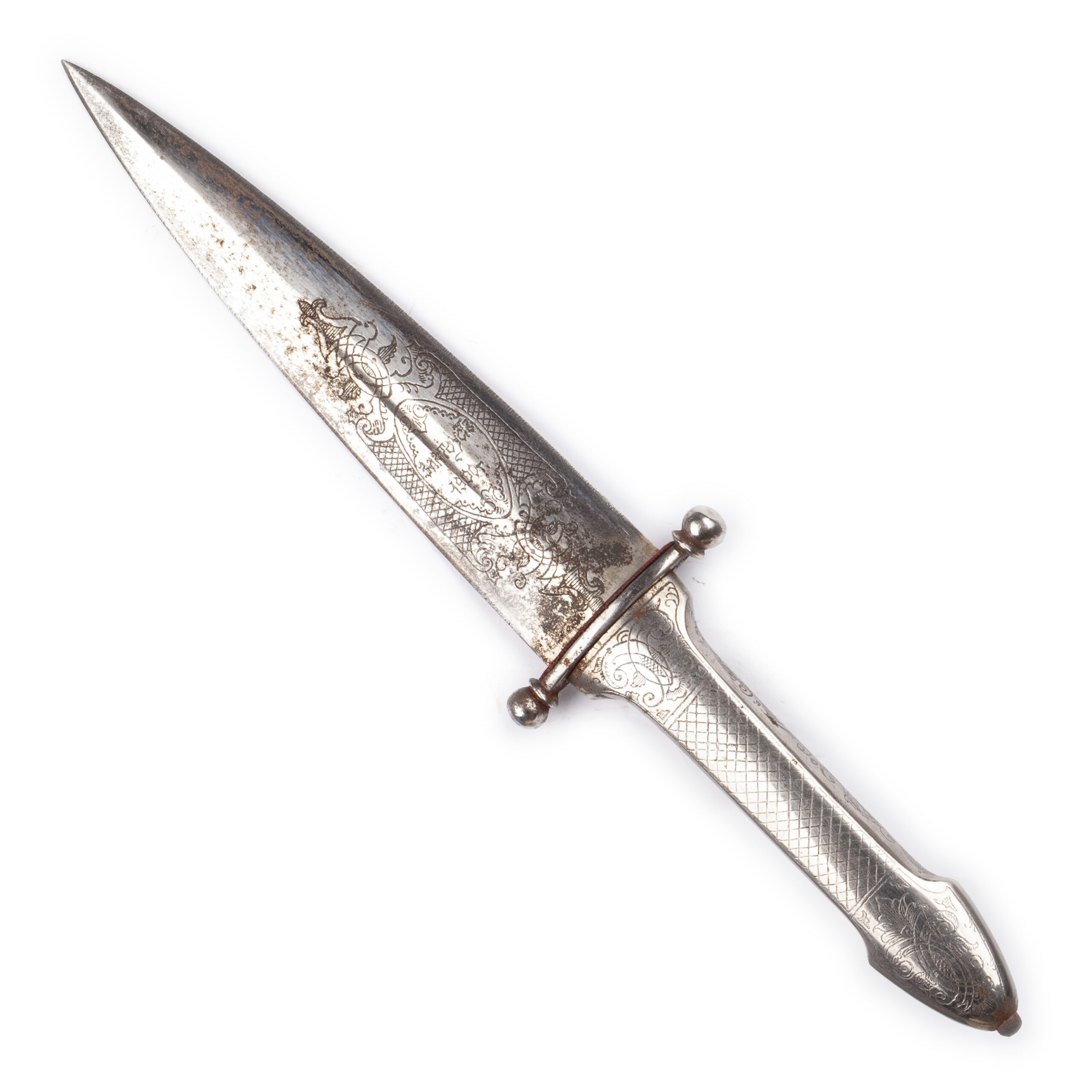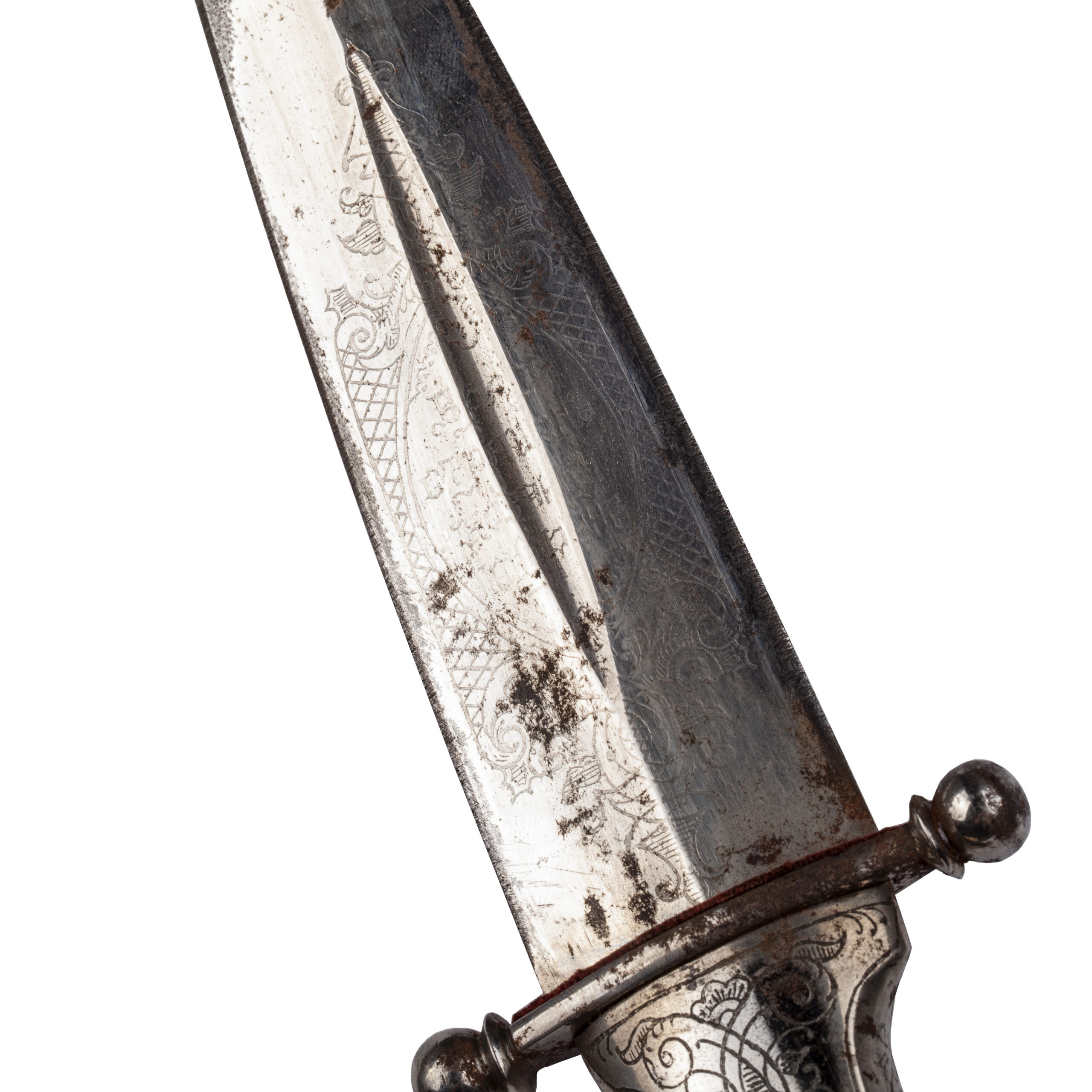 The broad single-edged blade, 23.6 cm in length, features a shallow fuller and retains traces of its original polish and etching. The hilt is fitted with a finely carved wooden grip decorated with floral scroll motifs, complemented by engraved steel mounts of rich ornamental character.