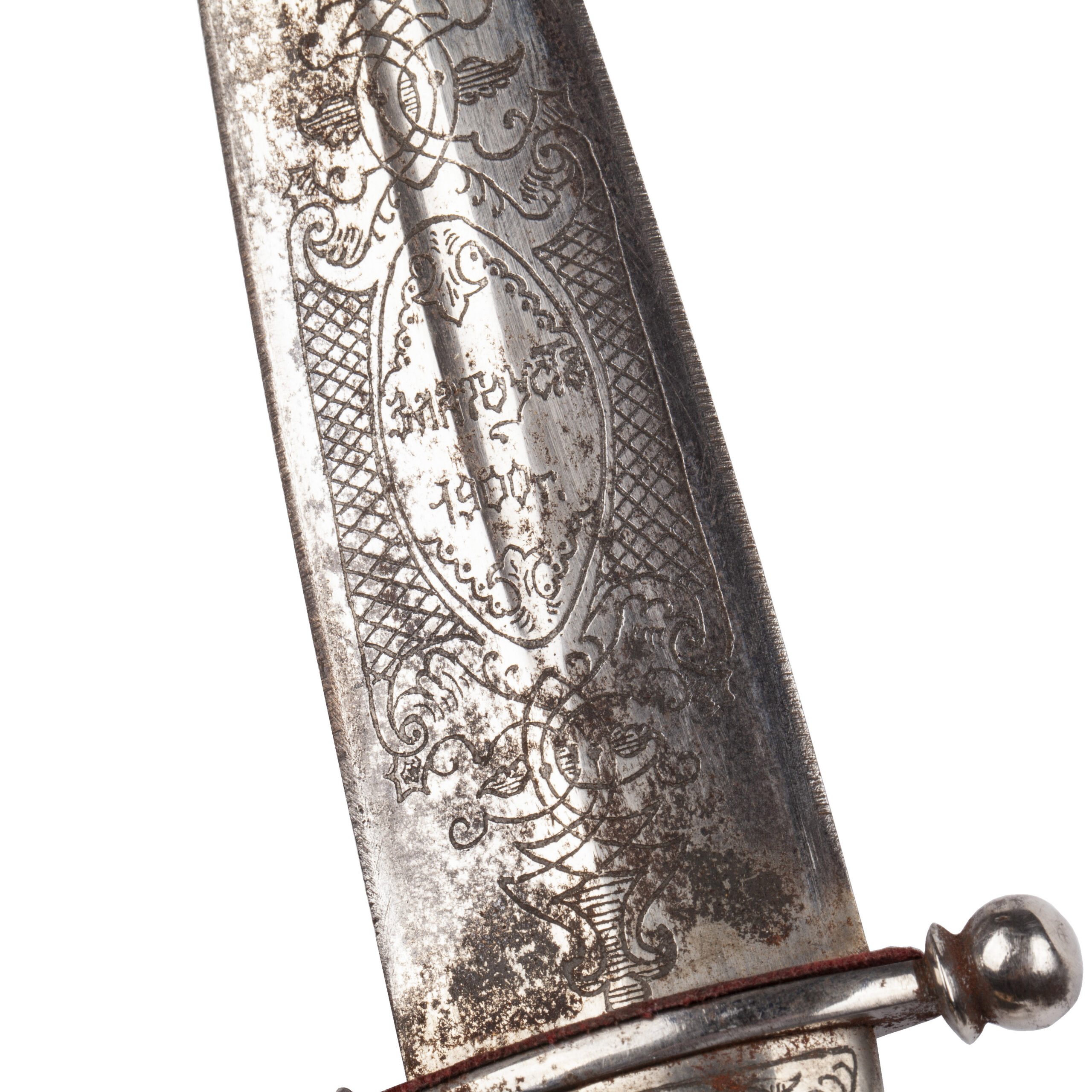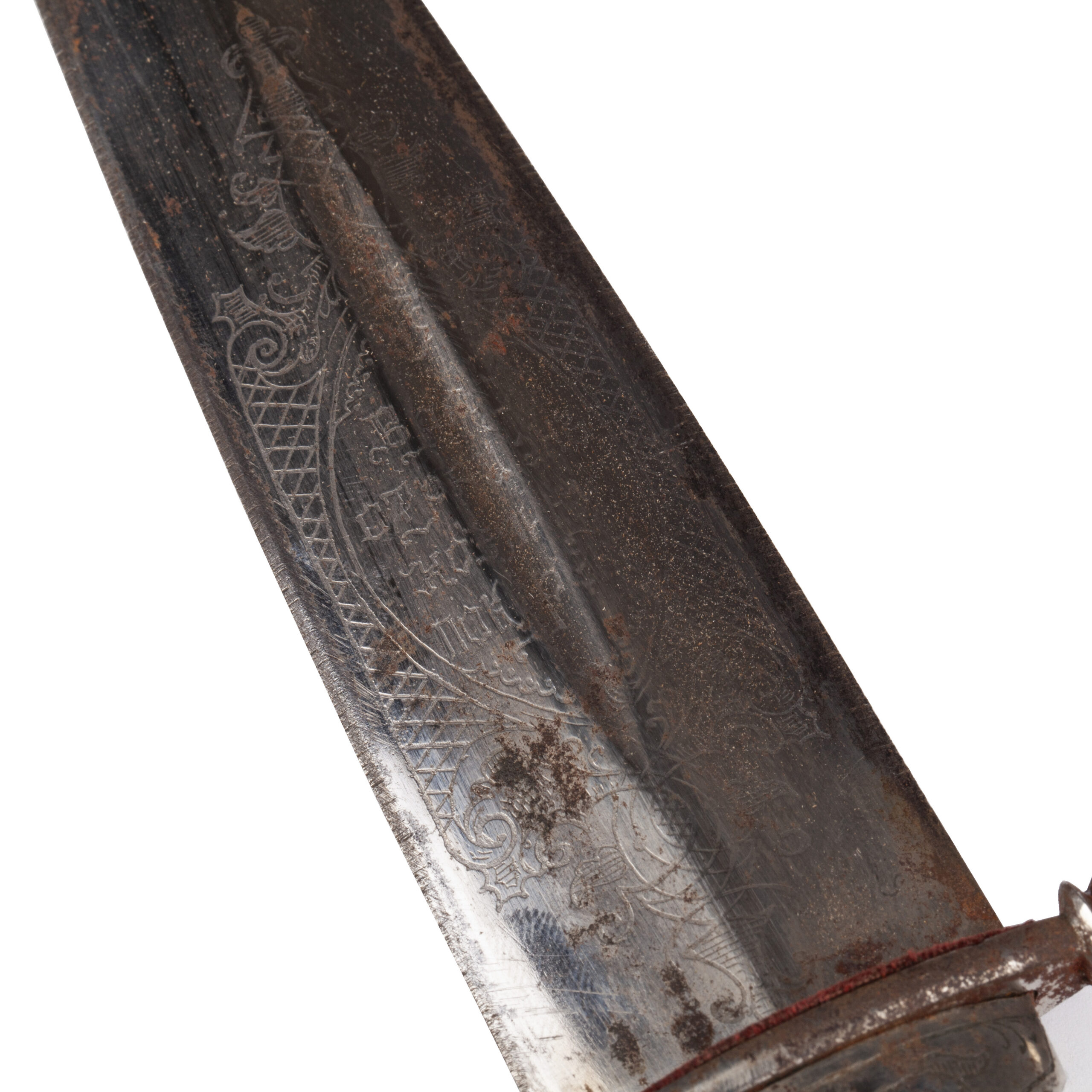 The single-edged blade features a central fuller and remains decorated with etched floral and geometric ornamentation, partly preserved despite visible age patina. The decorative etching reflects the characteristic artistic motifs of late Imperial Russia.