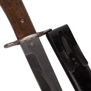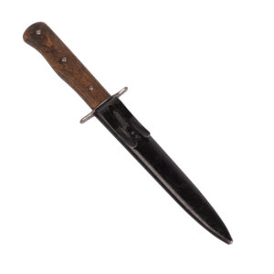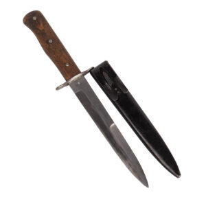 A World War II–era Luftwaffe fighting knife, finely preserved and in very good condition. The blade retains its original crossgrain finish and bears a Luftwaffe acceptance stamp near the ricasso. Fitted with the standard metal guard and ribbed grip characteristic of mid-war issue examples. A well-preserved and authentic piece of German military equipment from the period.