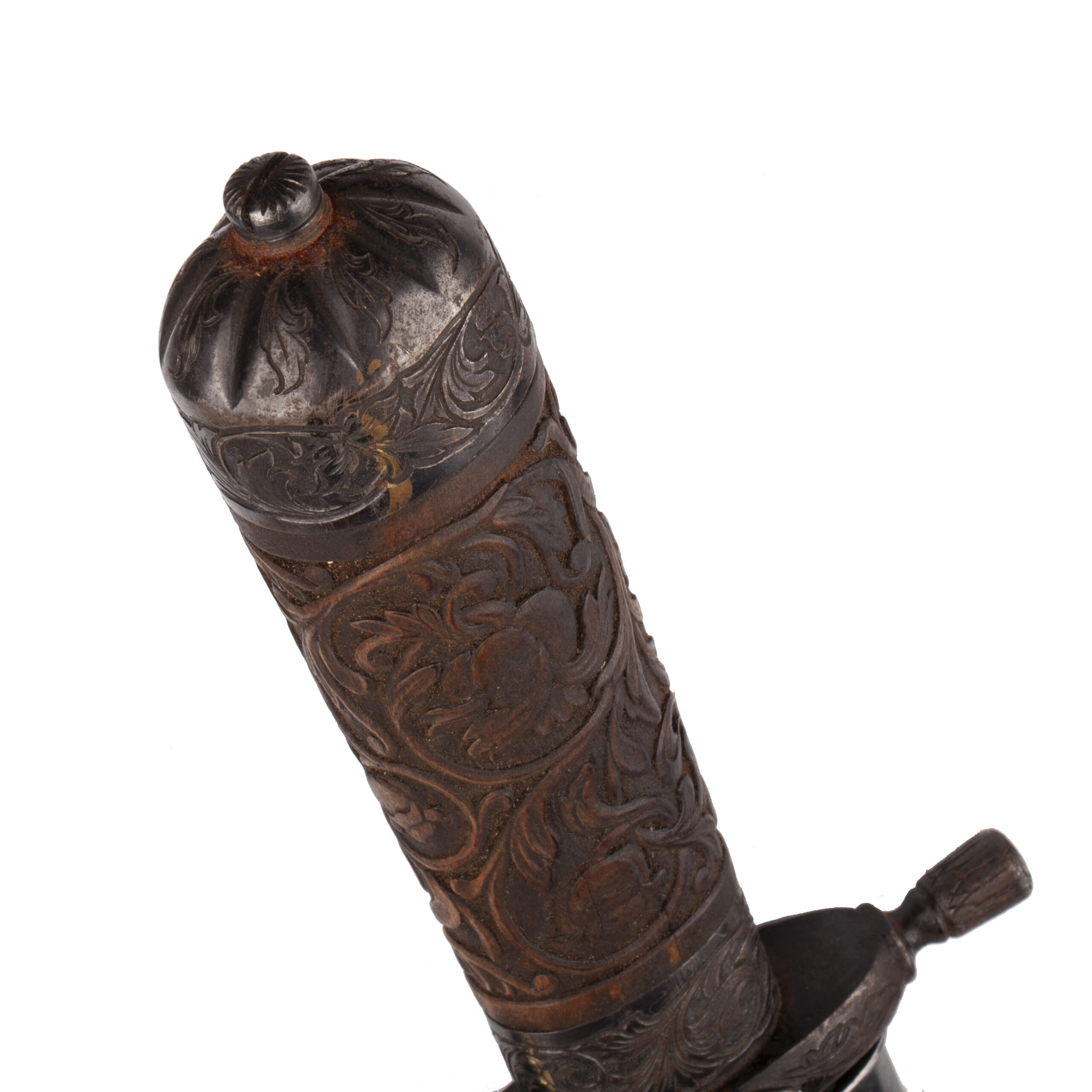 The sword retains its black-lacquered metal scabbard with gilt brass fittings and two suspension rings, showing only light wear.