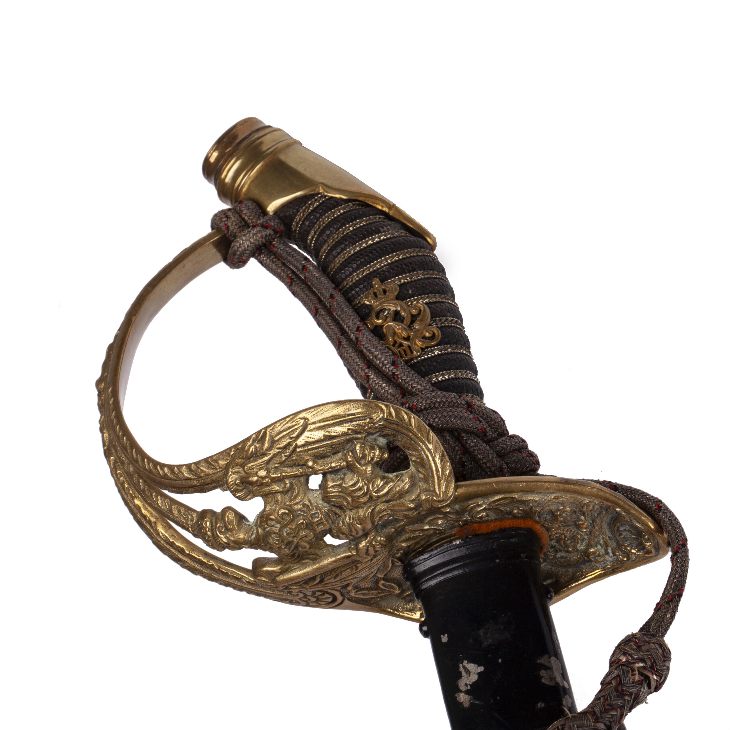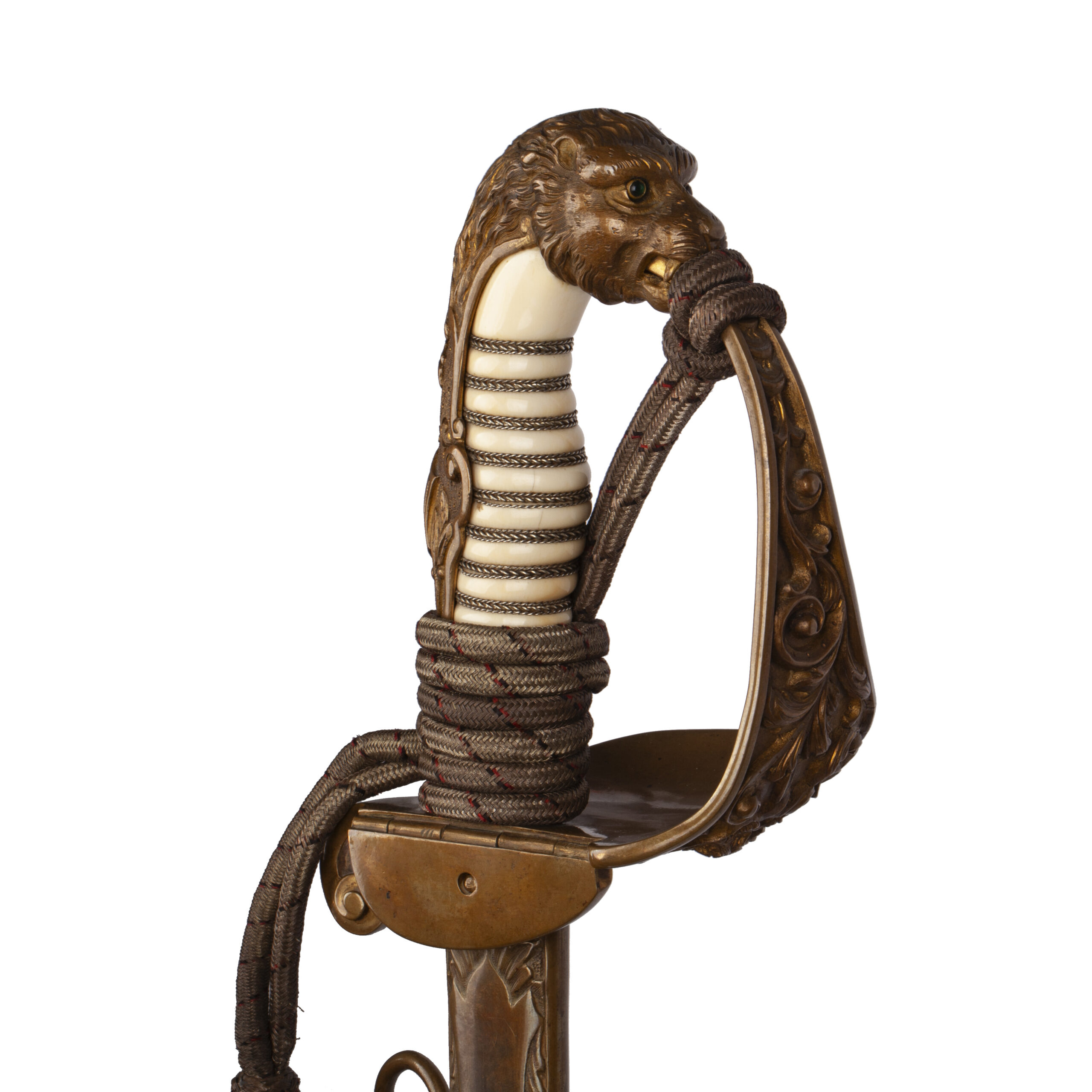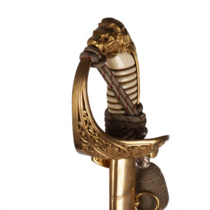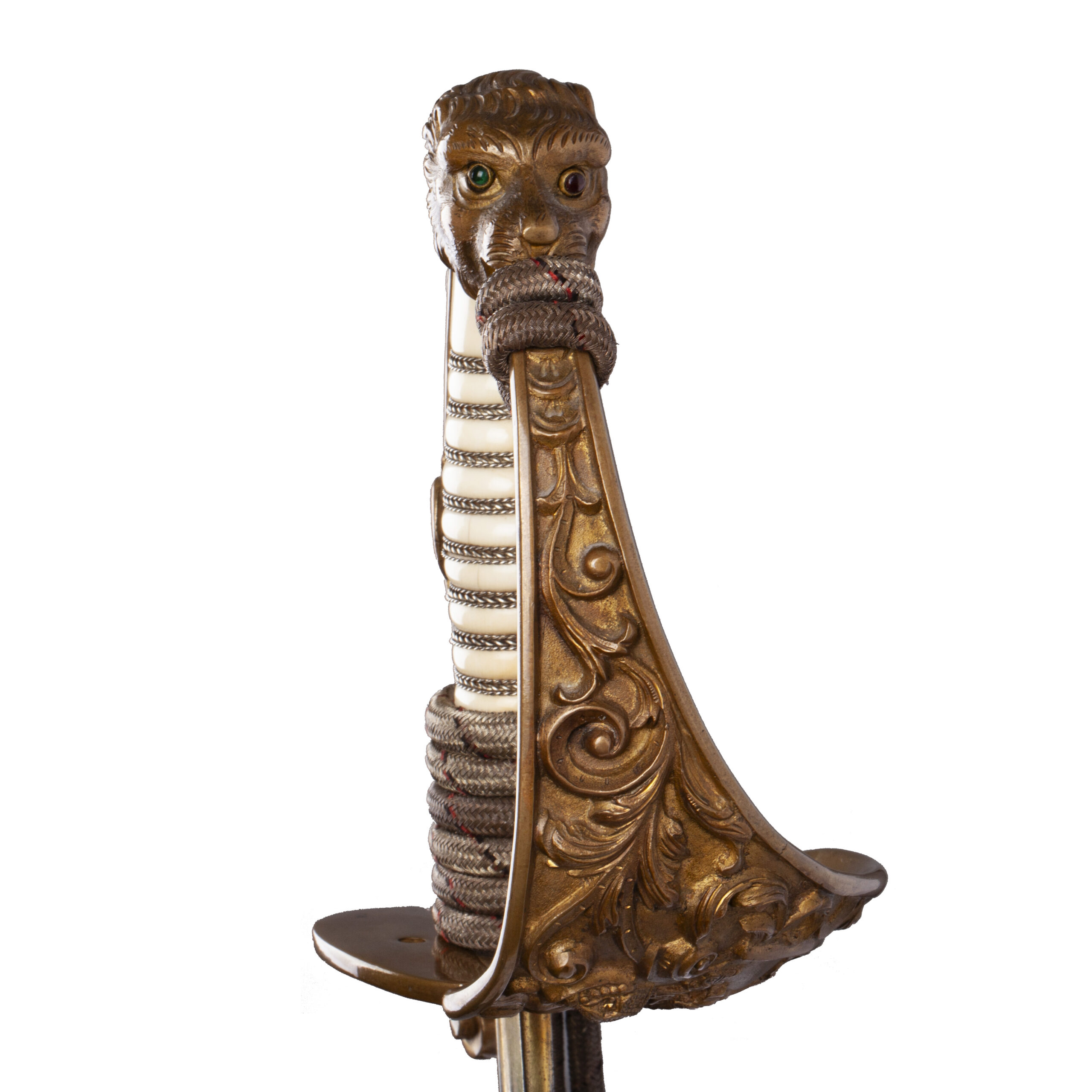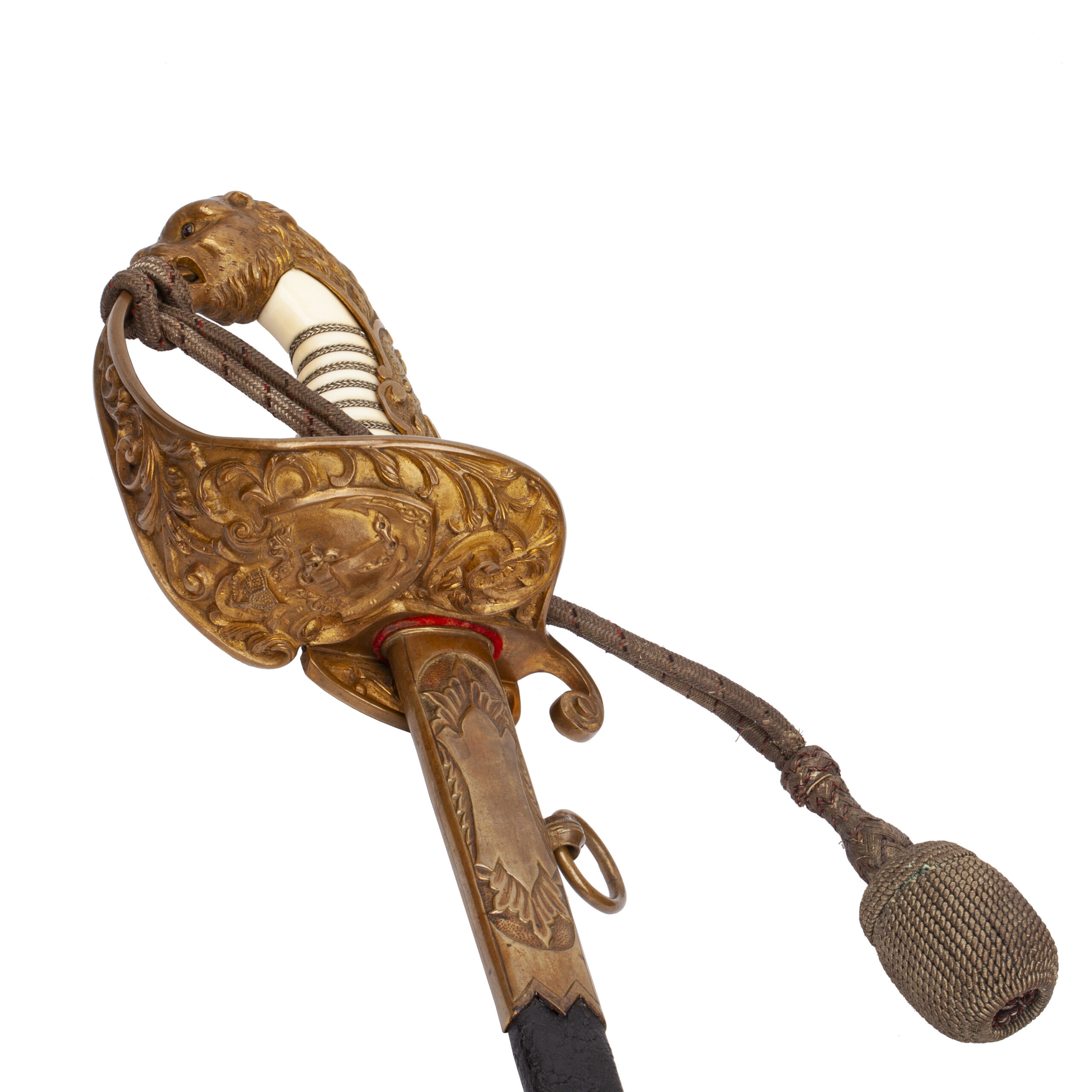 The hilt is of gilded brass, richly decorated with acanthus leaves, oak branches, and the Imperial crown over fouled anchor in relief. The lion’s head pommel has inset red glass “eyes,” and the white grip is bound with gilt wire. The original officer’s bullion portépée is still attached.