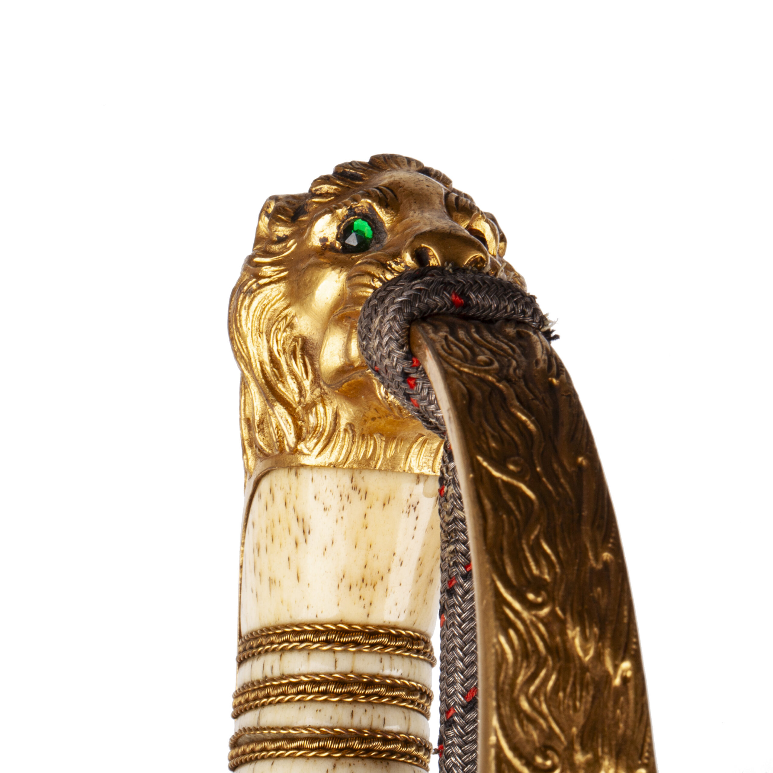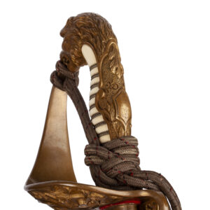 An outstanding and extremely rare deluxe Imperial German naval officer’s sword, featuring a highly unusual lion-head pommel with one green and one red glass eye — a very scarce variant among known examples. The lion’s head is of a rare sculptural type with exceptionally fine detailing and a powerful expression, symbolizing strength and command.