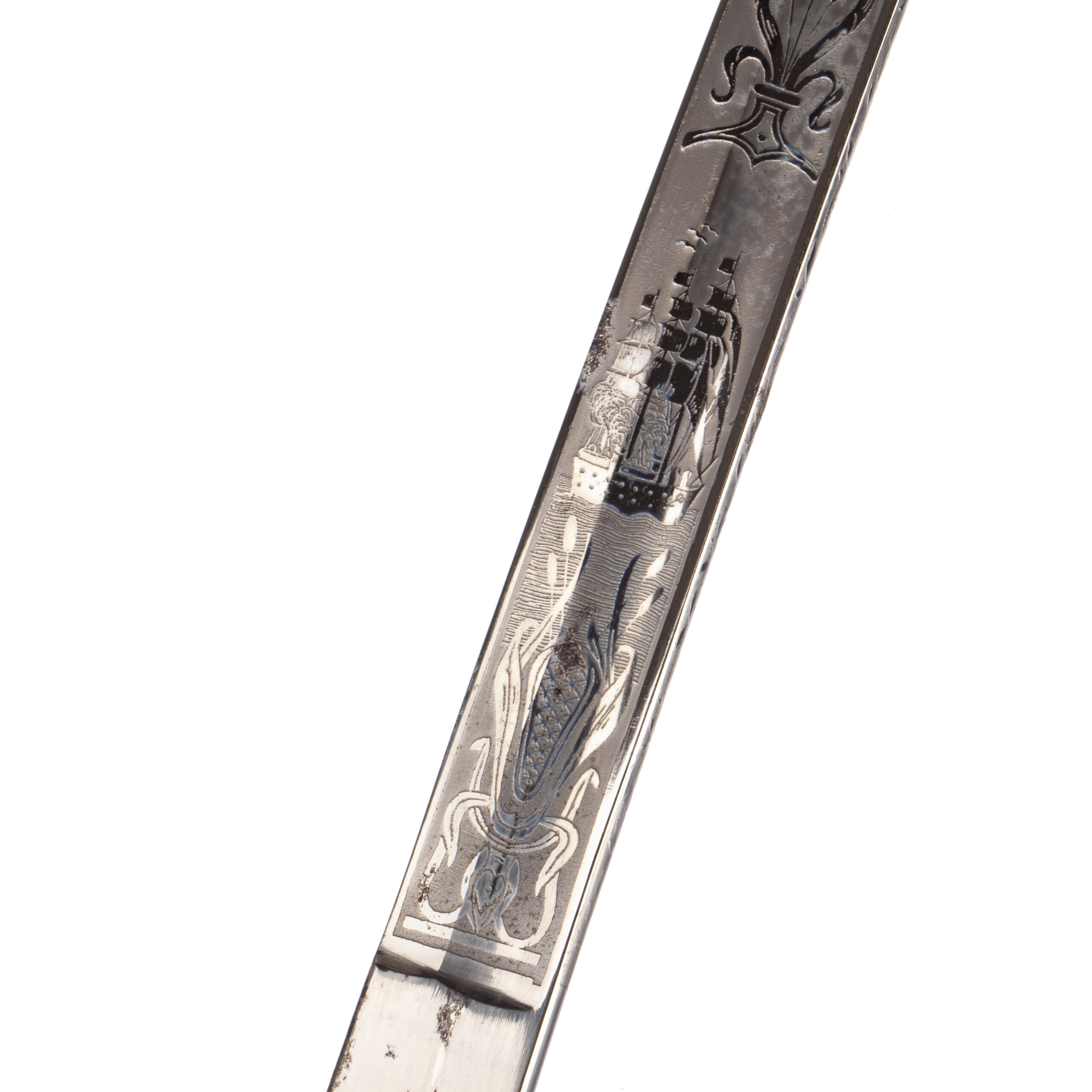 The magnificent Damascus steel blade displays a beautiful watered pattern throughout, enhanced with deep blue and gilded panels depicting naval trophies, crowned anchors, and acanthus scrollwork.
