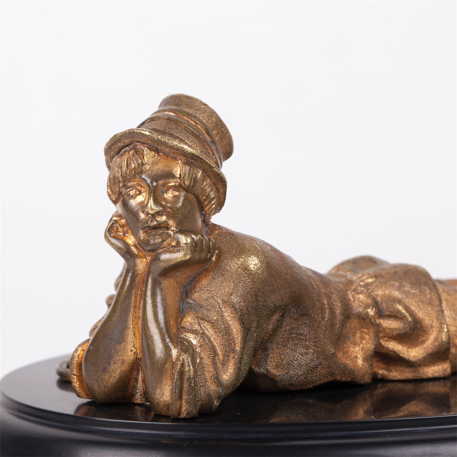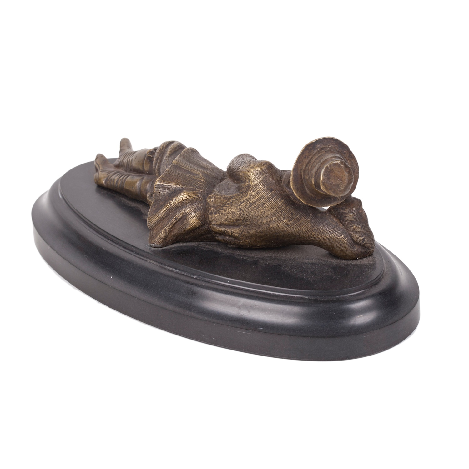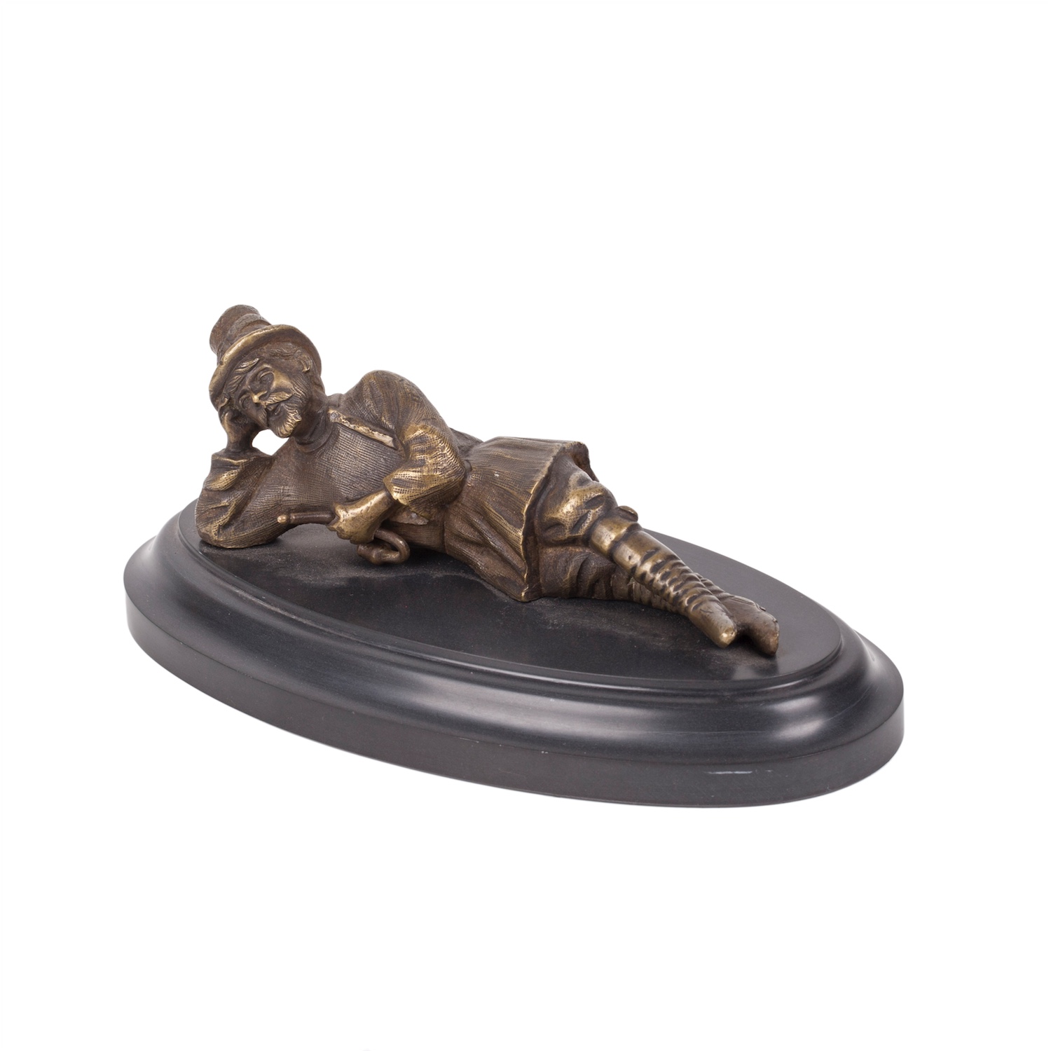 8 × 24 × 7 cmThis finely cast gilt bronze paperweight represents a reclining Circassian figure, dressed in traditional attire, holding a rifle and a pipe. Objects of this kind were popular decorative desk accessories in 19th-century Russia, reflecting both interest in the Caucasus region and the era’s fascination with exotic and ethnographic themes.