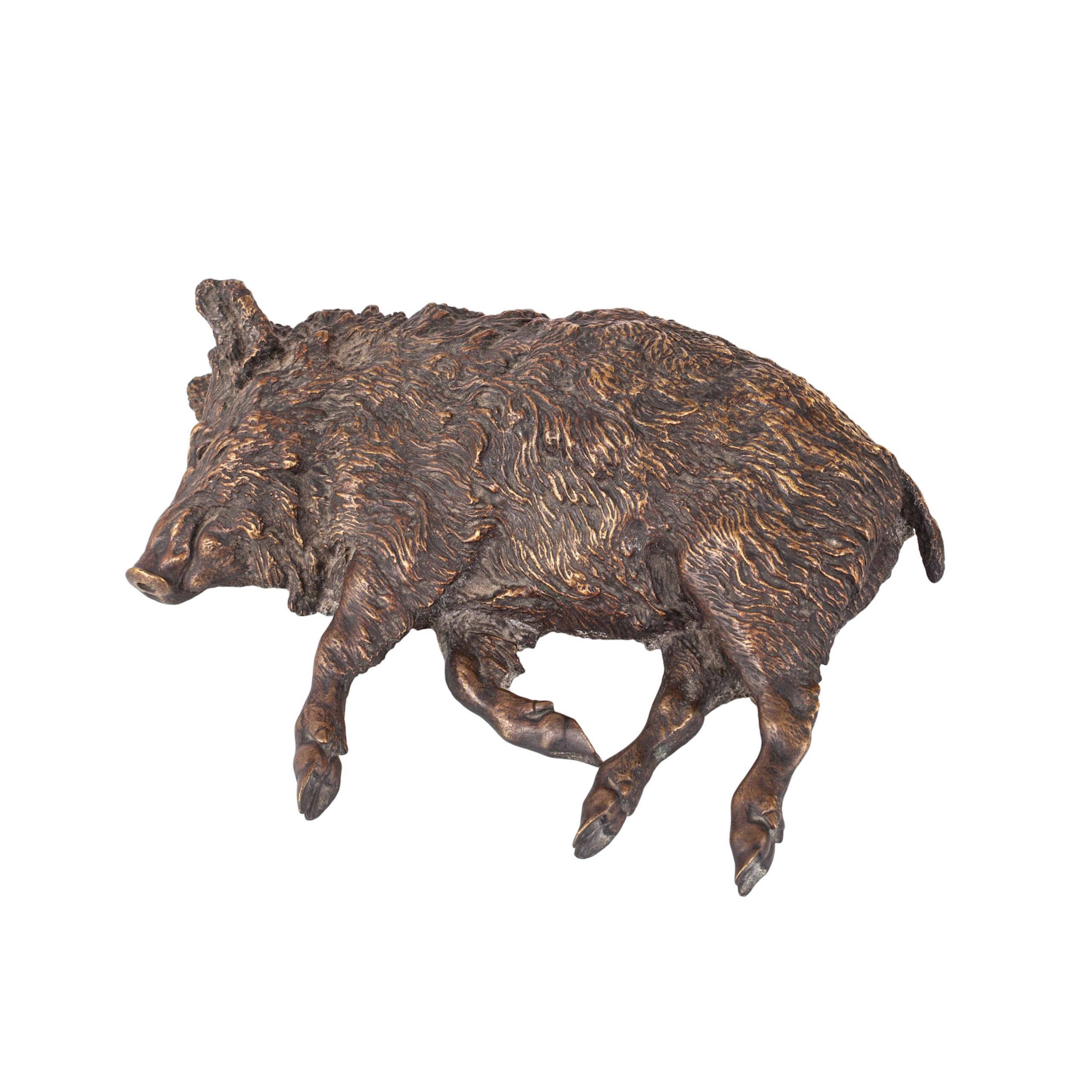 St. Petersburg, 1870s–1880sThis finely detailed bronze sculpture depicts a wild boar lying on the ground, rendered with naturalistic accuracy and careful attention to the animal’s anatomy and textured fur.