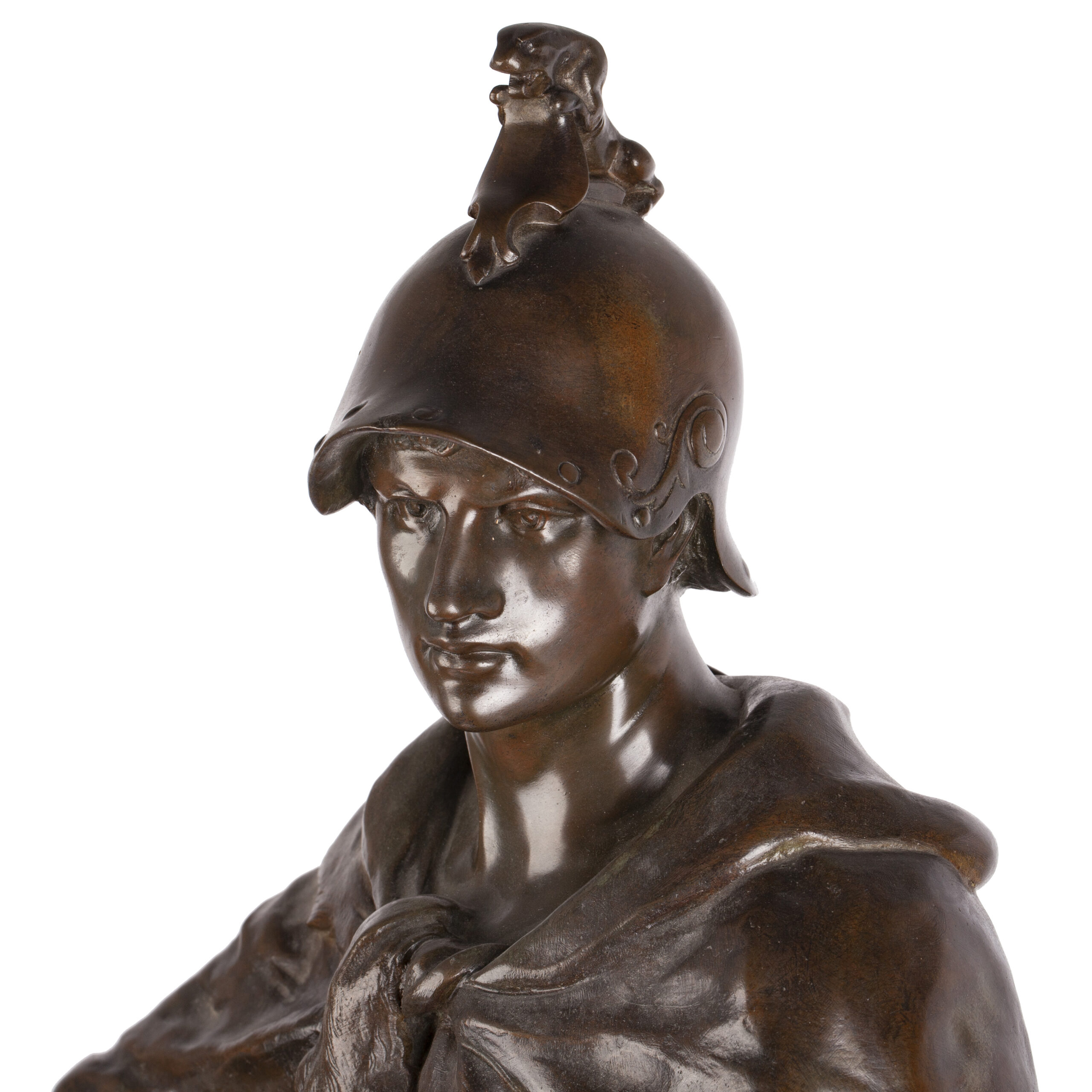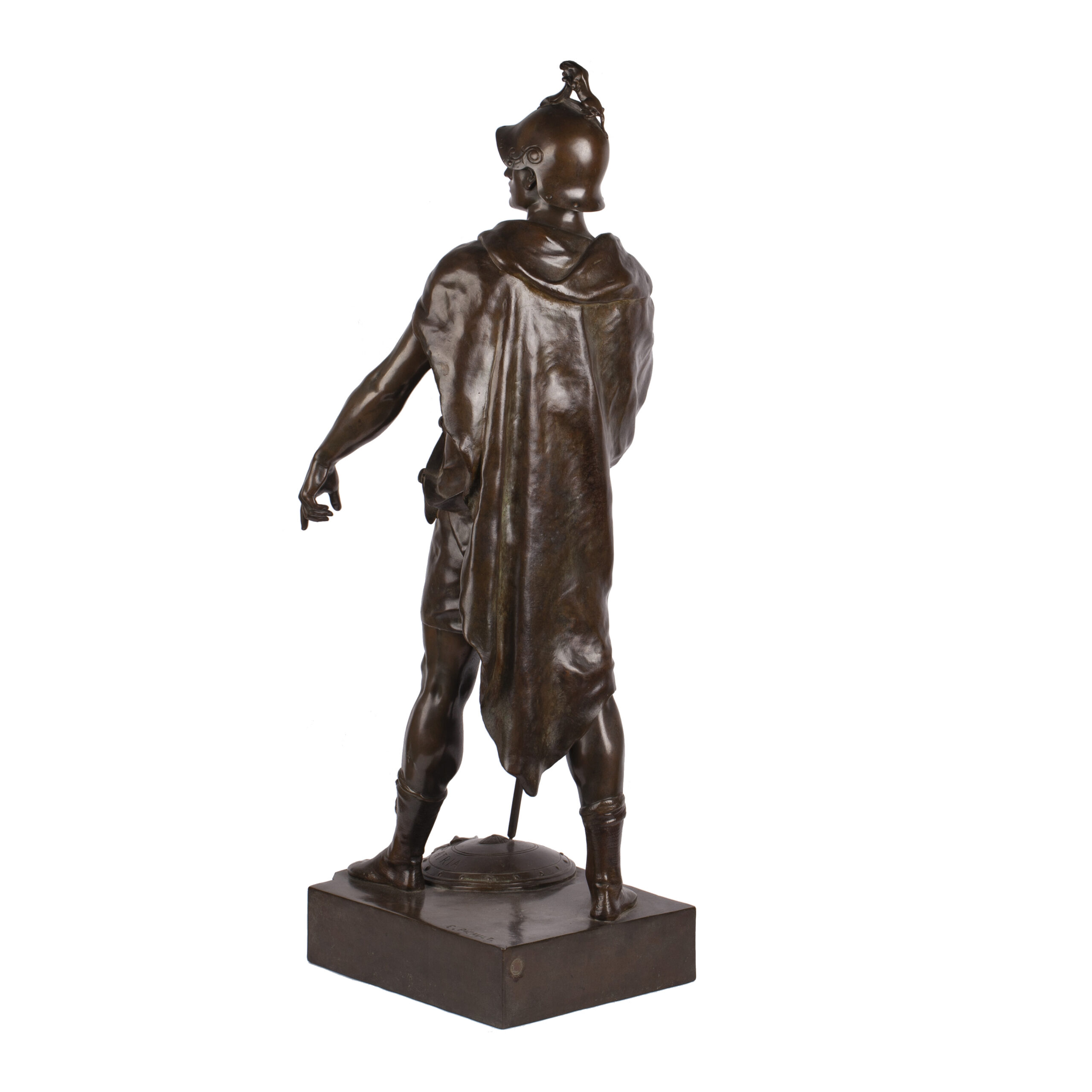 This finely cast bronze by Émile Louis Picault represents Le Devoir — “Duty” — a classical warrior symbolizing civic virtue, courage, and moral steadfastness. The figure stands poised, holding a sword, embodying the ideals of honor and devotion to one’s homeland. The work’s dynamic realism and noble restraint exemplify the heroic allegorical style that made Picault one of the most admired sculptors of the French Third Republic.Cast with Picault’s characteristic attention to anatomy and drapery, the sculpture bears the mechanical reduction stamp of A. Collas, referring to Achille Collas’s innovative 19th-century process for creating precise scaled reductions of large bronzes.
