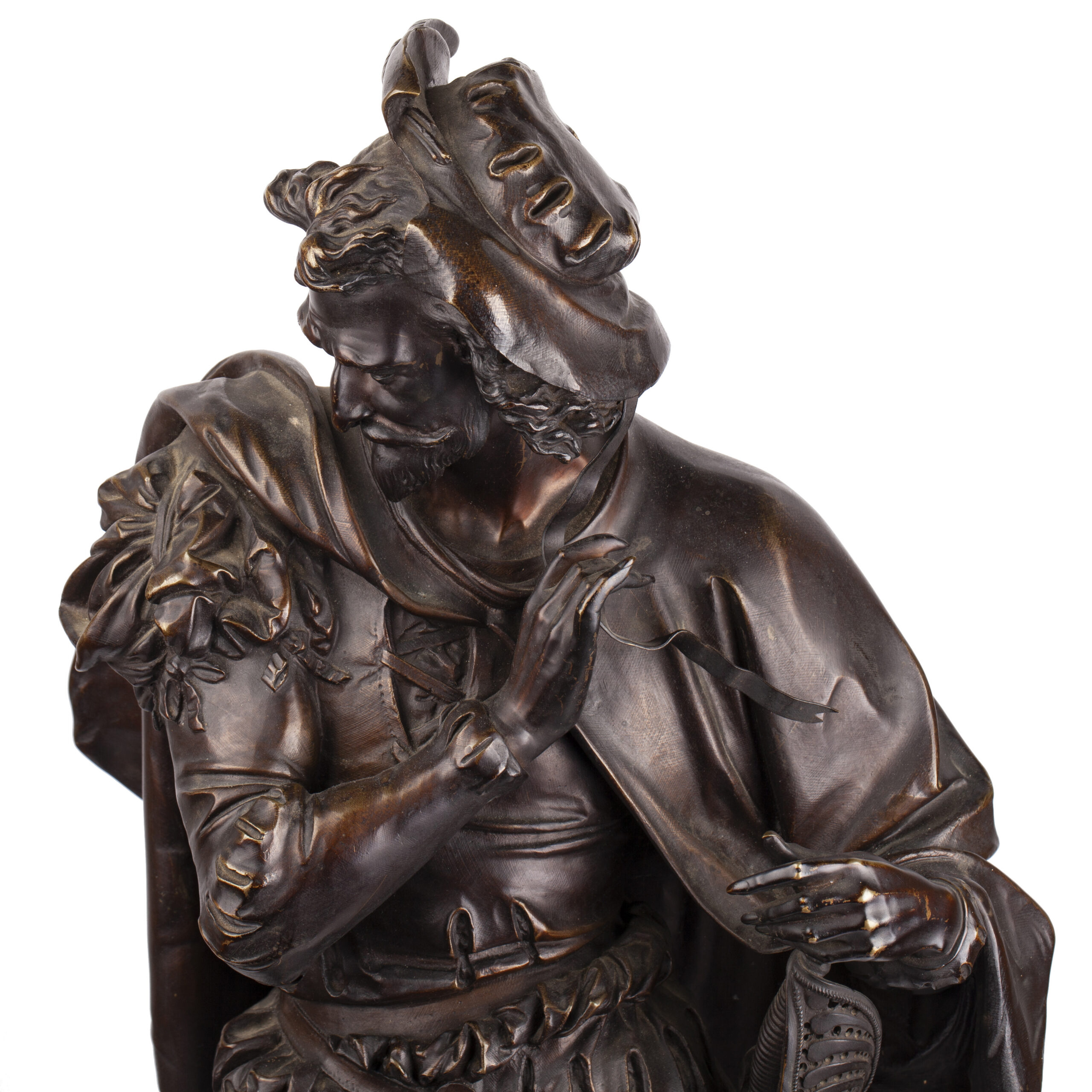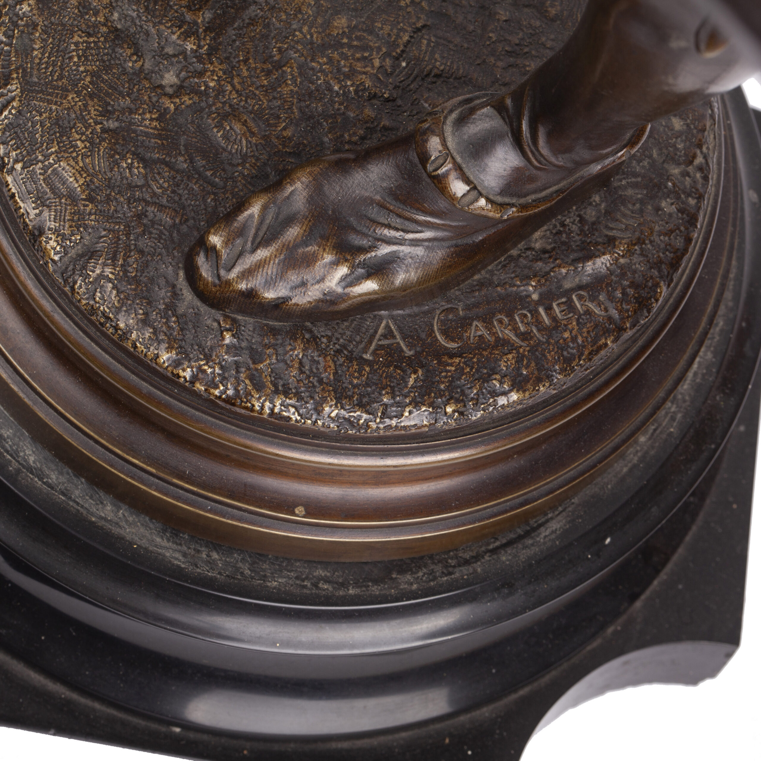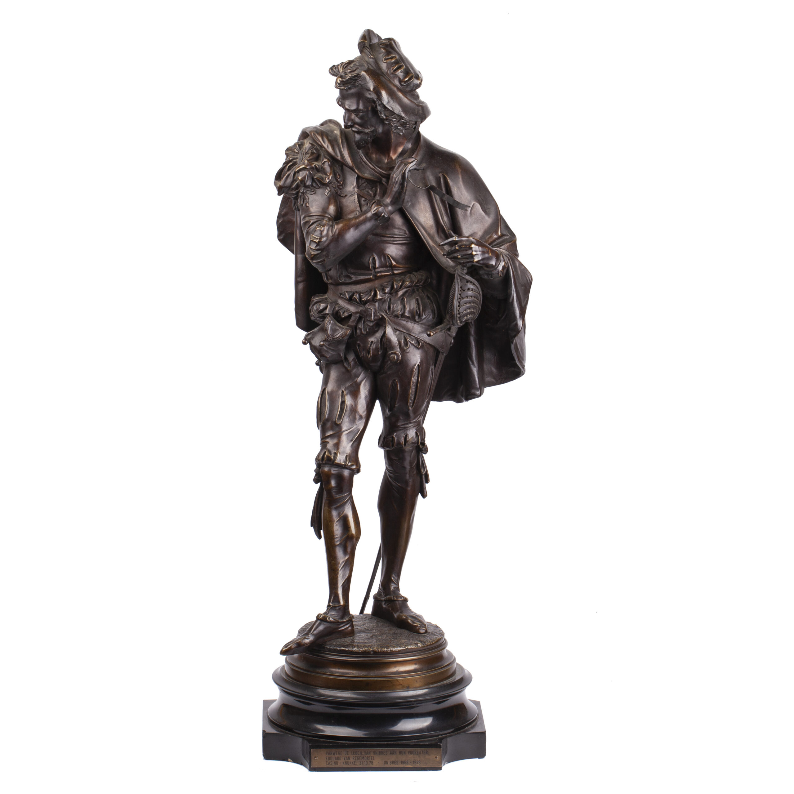 This finely modeled bronze by Auguste Joseph Carrier depicts a musketeer, elegantly dressed in Renaissance attire, captured in a moment of composed confidence. The figure’s detailed costume — complete with plumed hat, cloak, and sword — reflects the romantic fascination with chivalric and historical themes that characterized 19th-century French sculpture.The sculpture rests on a black stone base showing minor age-related cracks, which do not detract from its strong aesthetic presence.