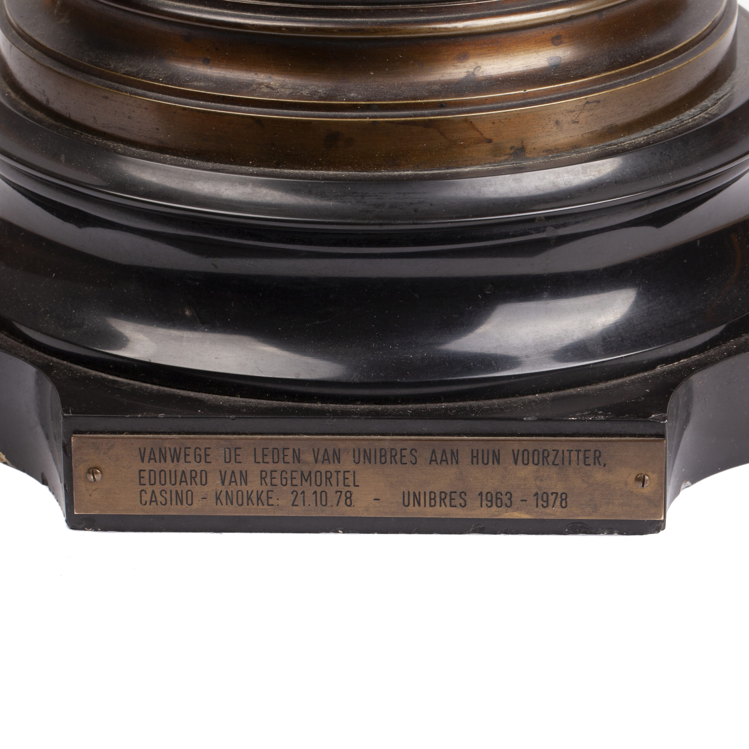 Patinated bronze on black stone baseHeight with the stone: 79,5 cm.