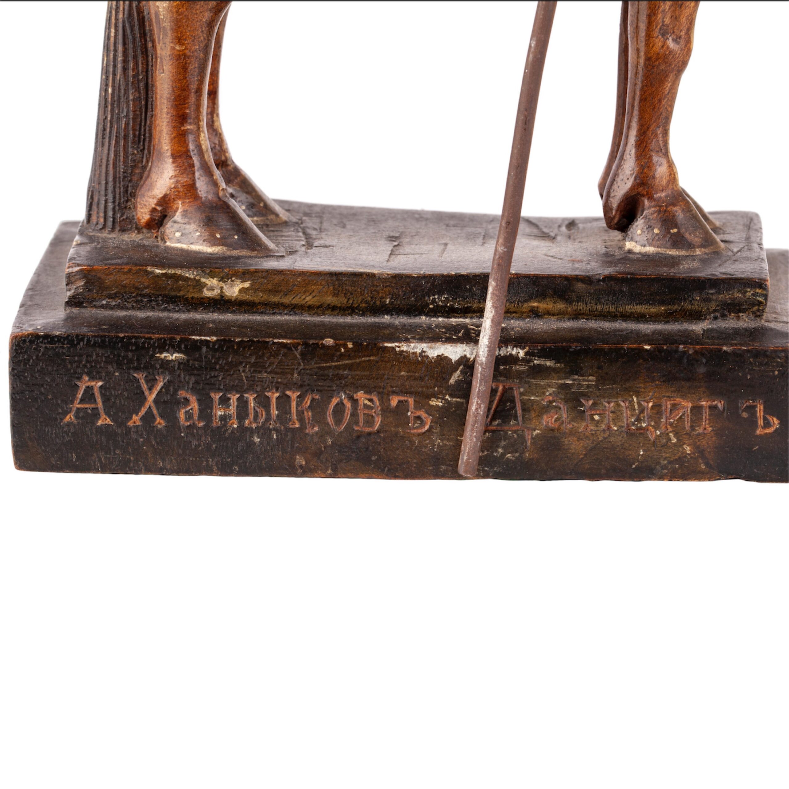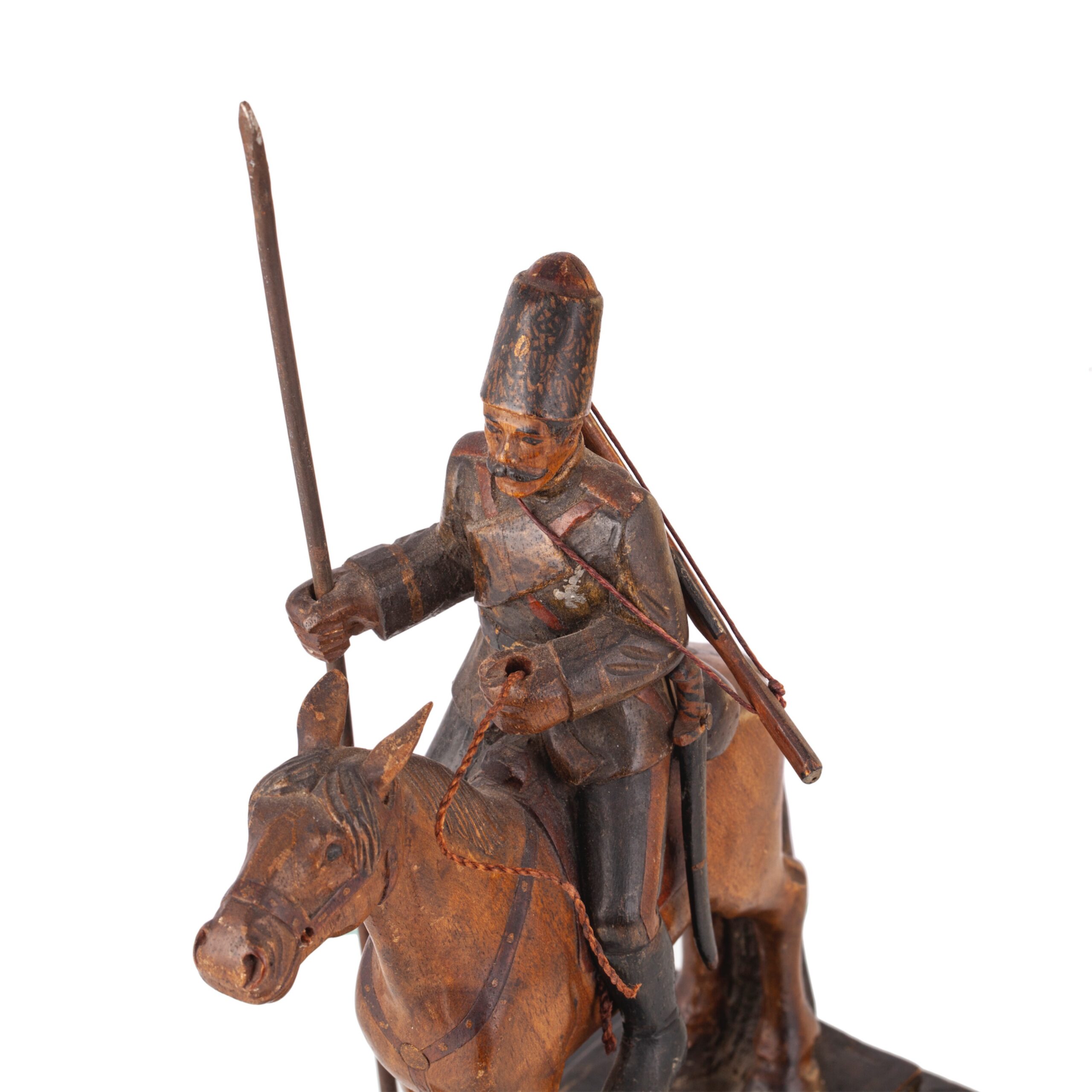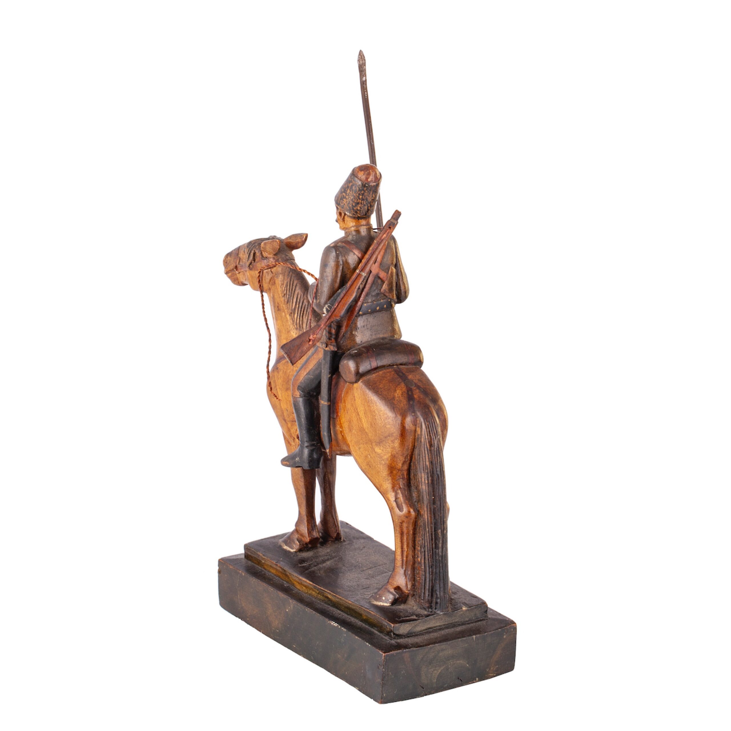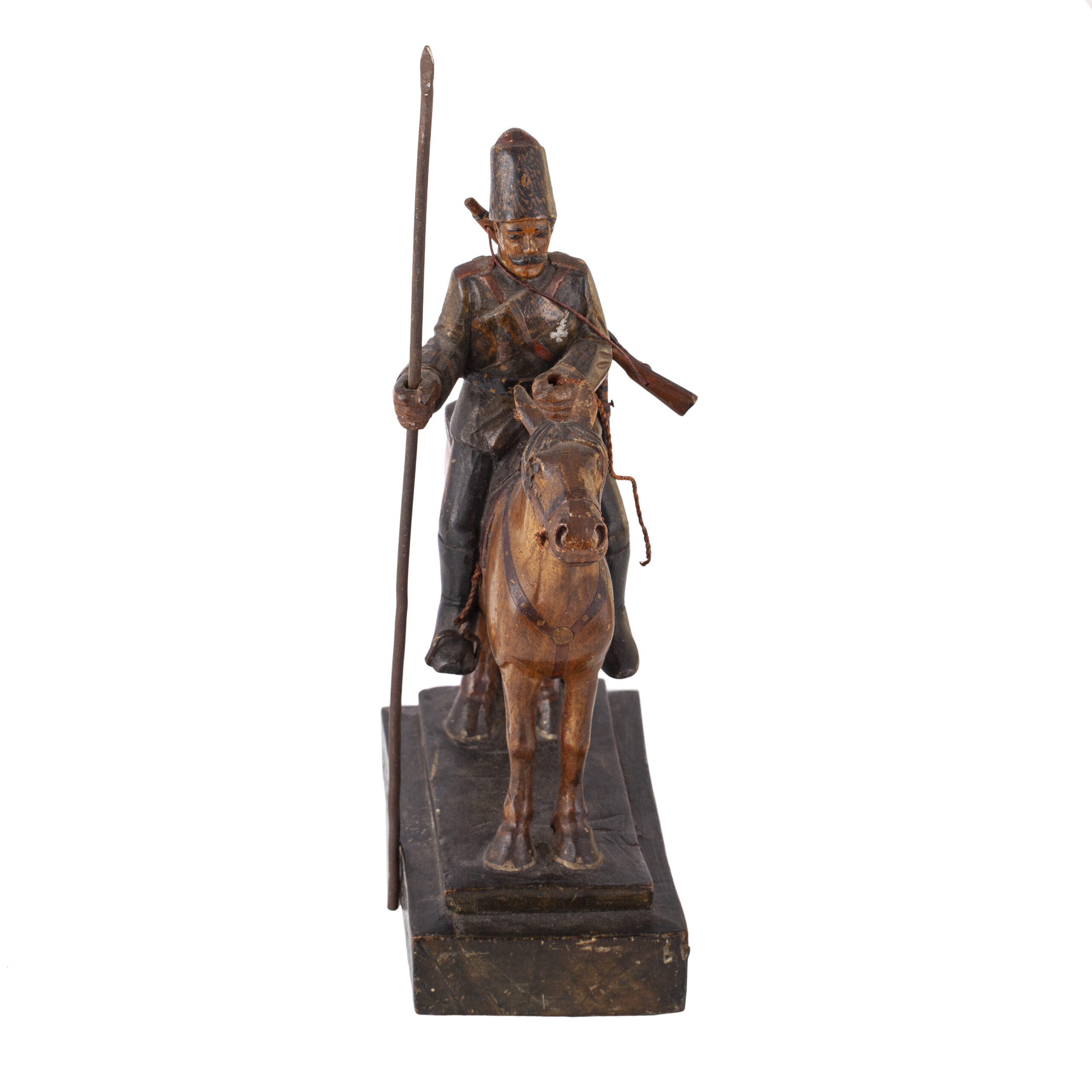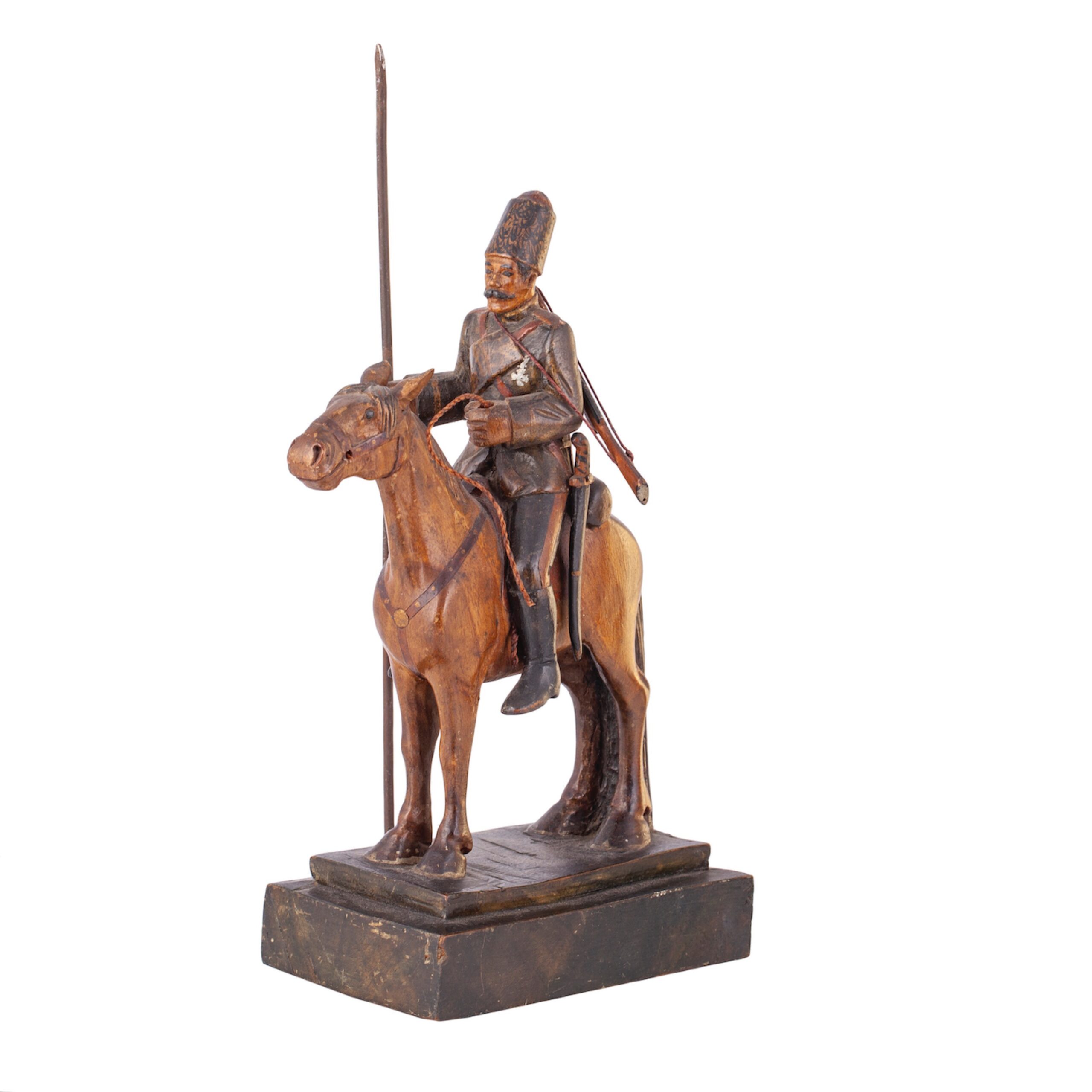 Inscribed: “А. Ханыковъ. Данцигъ”A finely carved wooden composition depicting a Cossack horseman, holding a lance and seated on a spirited mount. The sculpture bears a dedication to Alexander Vladimirovich Khanykov (1825–1853) — a noted Russian revolutionary and member of the Petrashevsky Circle, an intellectual and reformist movement in mid-19th century St. Petersburg.