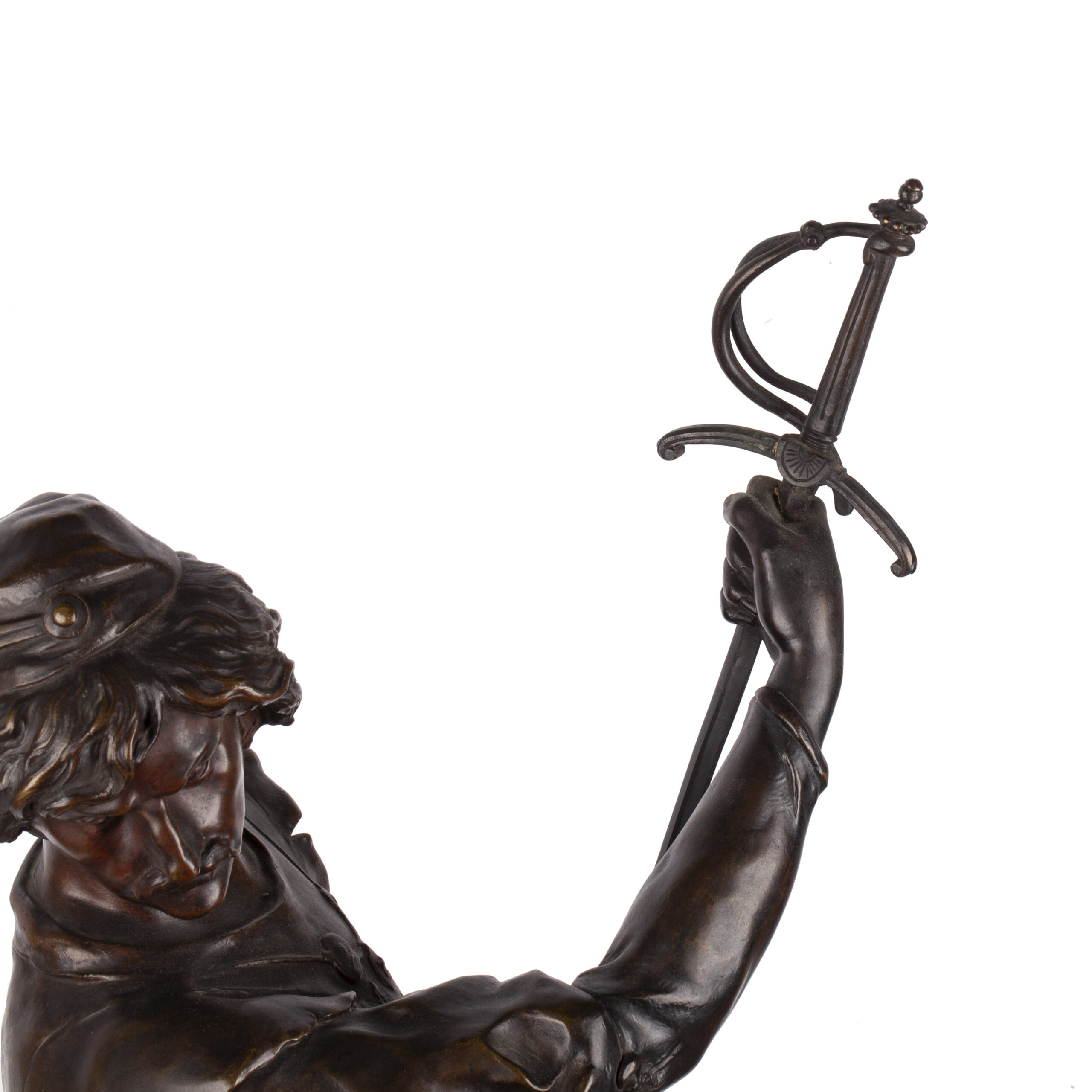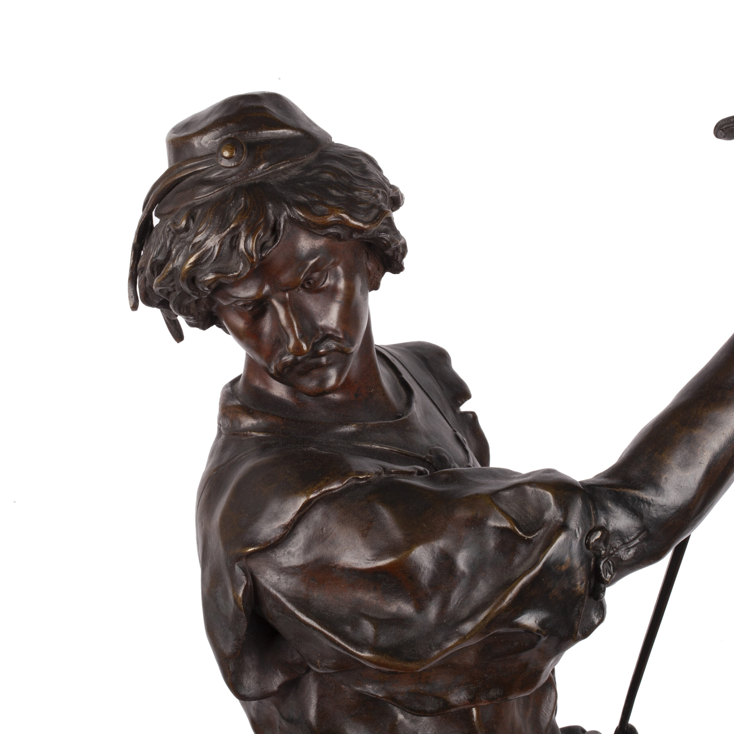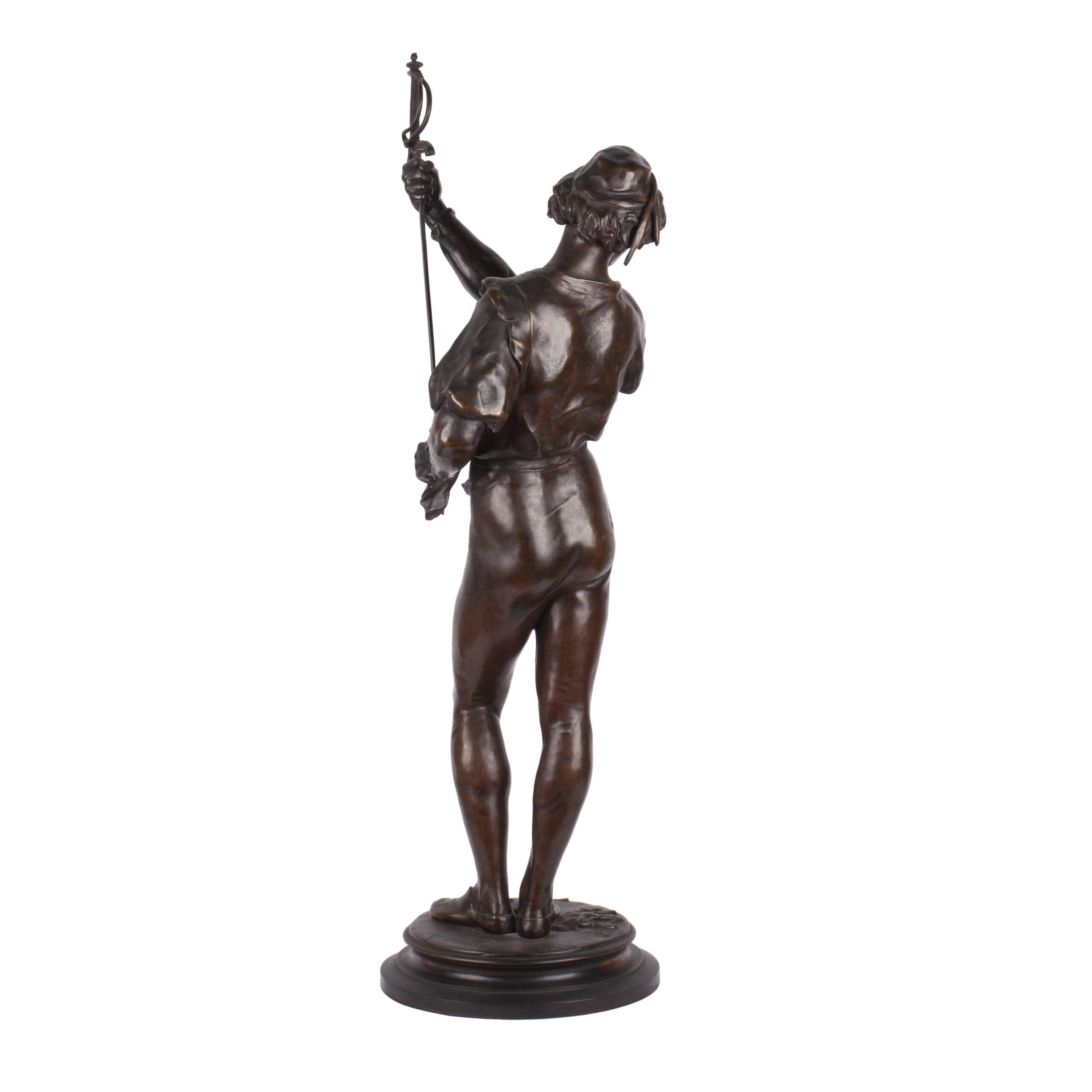 Height: 72 cmAn exceptional bronze sculpture by Émile Louis Picault, one of France’s most prolific and celebrated 19th-century sculptors. The Fencer (Le Tireur) depicts a duelist captured in a moment of poised triumph, raising his sword aloft in salute or victory. The figure’s dynamic anatomy, tense musculature, and richly modeled costume reflect Picault’s masterful balance between Neoclassical idealism and the Romantic fascination with heroism and individuality.