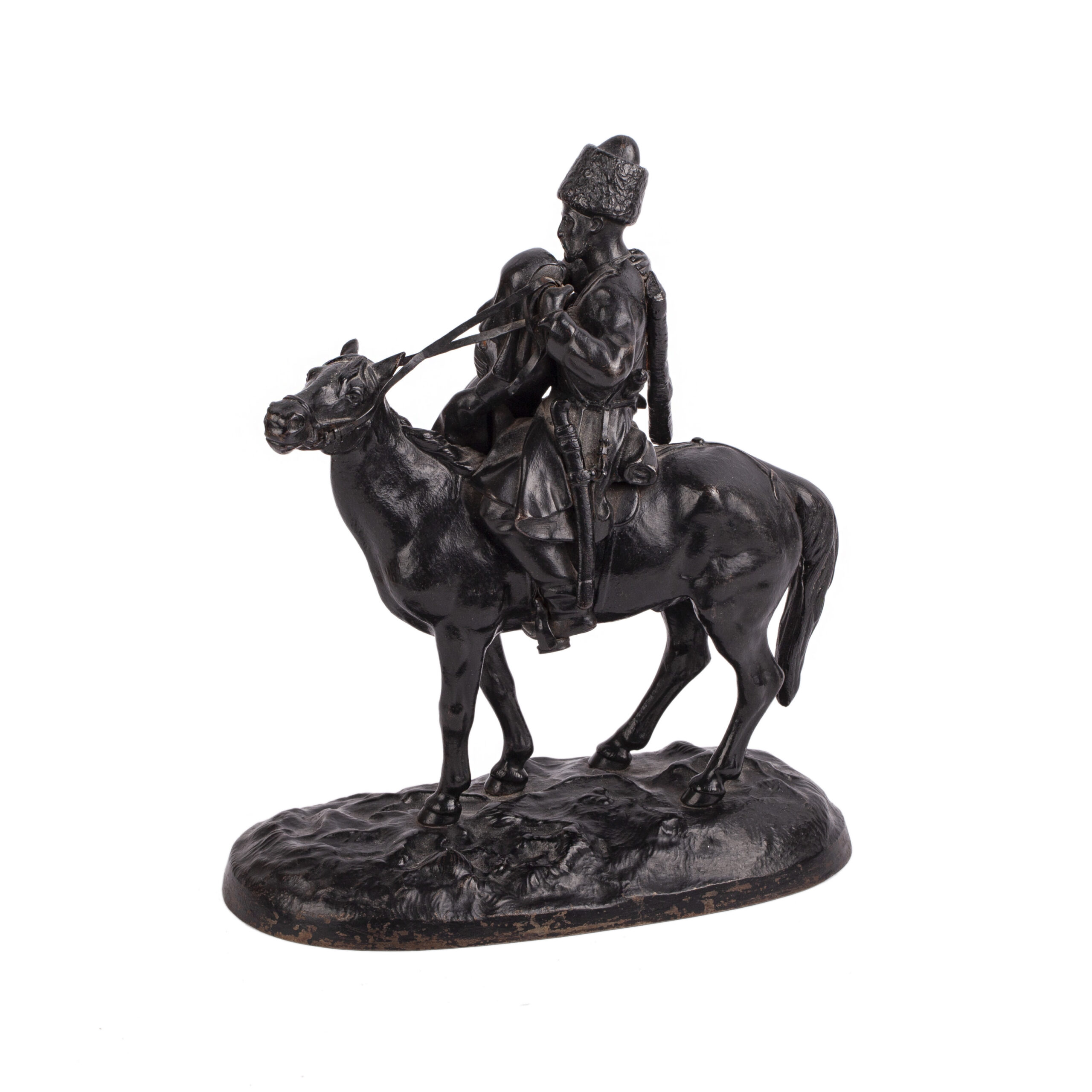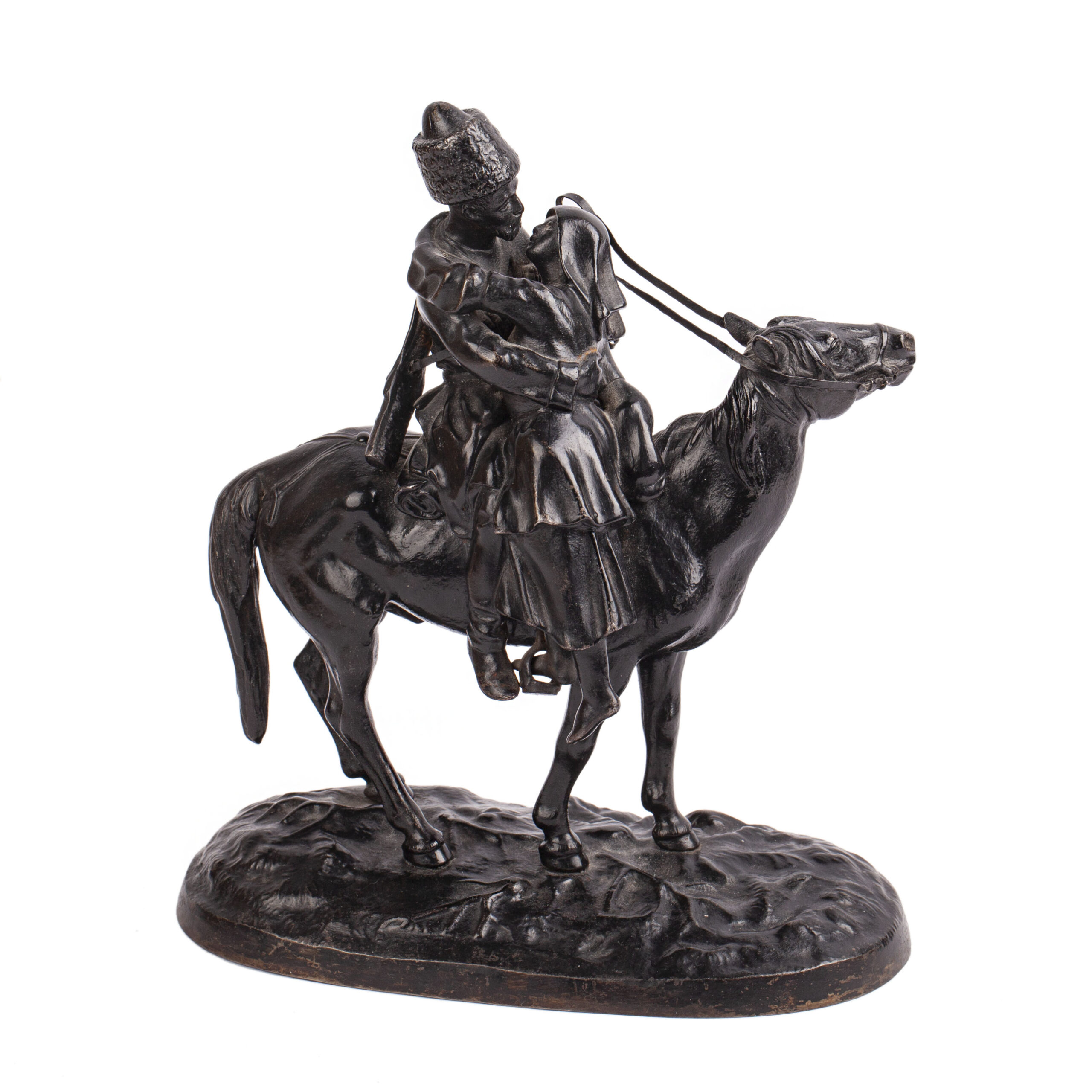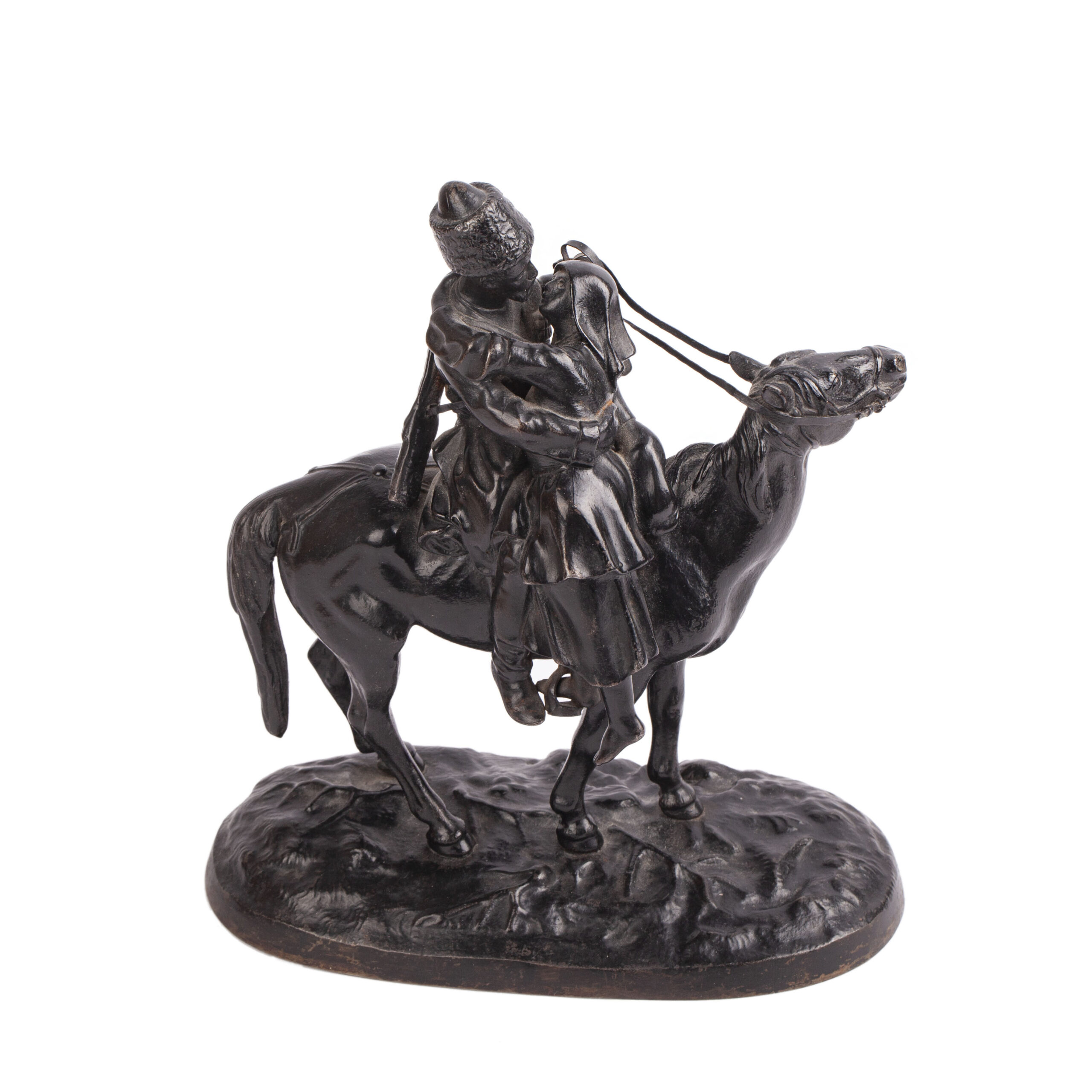 Height: 21.5 cm; base length: 18 cmThis sculptural composition depicts a poignant farewell scene: a Cossack, seated on horseback with a rifle in a case slung over his back, embraces his wife who rises toward his stirrup. The subject reflects the traditional role of the Cossacks, a privileged military estate in the Russian Empire from the 18th to early 20th centuries, who served as a stronghold of autocracy and were often mobilized in wartime.