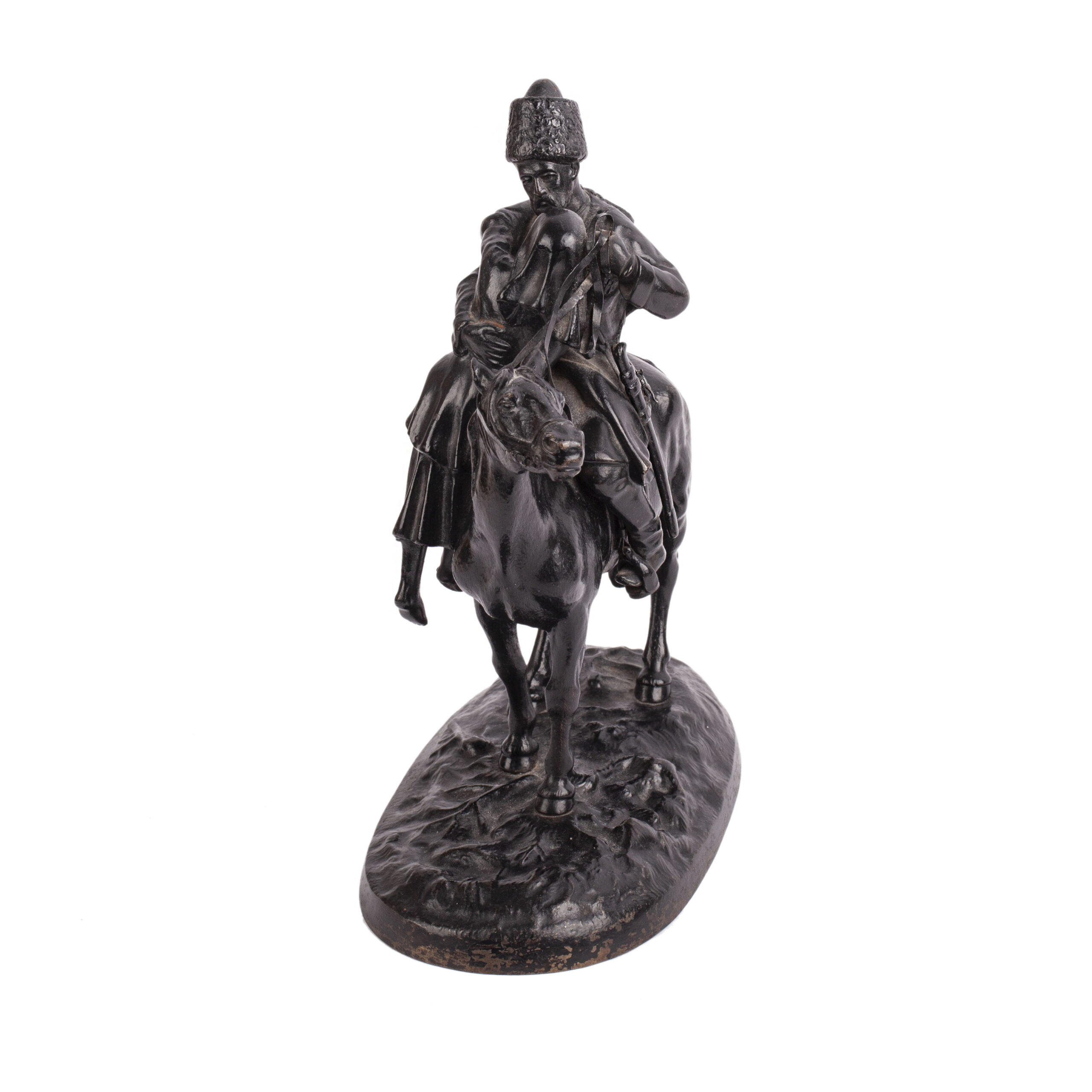 The model was created by Evgeny Alexandrovich Lanceray in 1878, inspired by his impressions of the Don Cossack Host. The Kasli Iron Foundry, one of Russia’s most renowned centers of artistic iron casting, reproduced this piece in the early 20th century, as evidenced by the factory marks preserved on the underside and base.