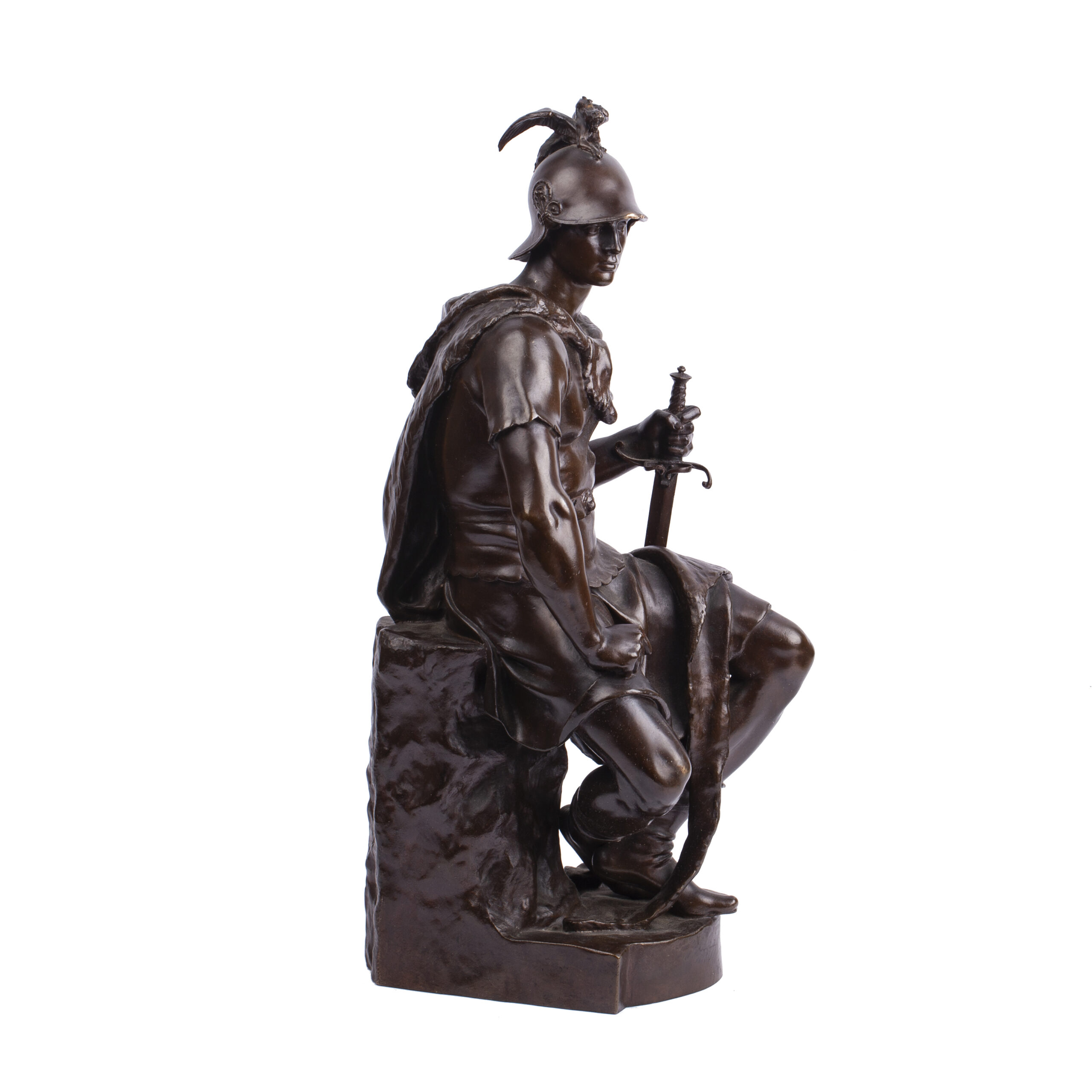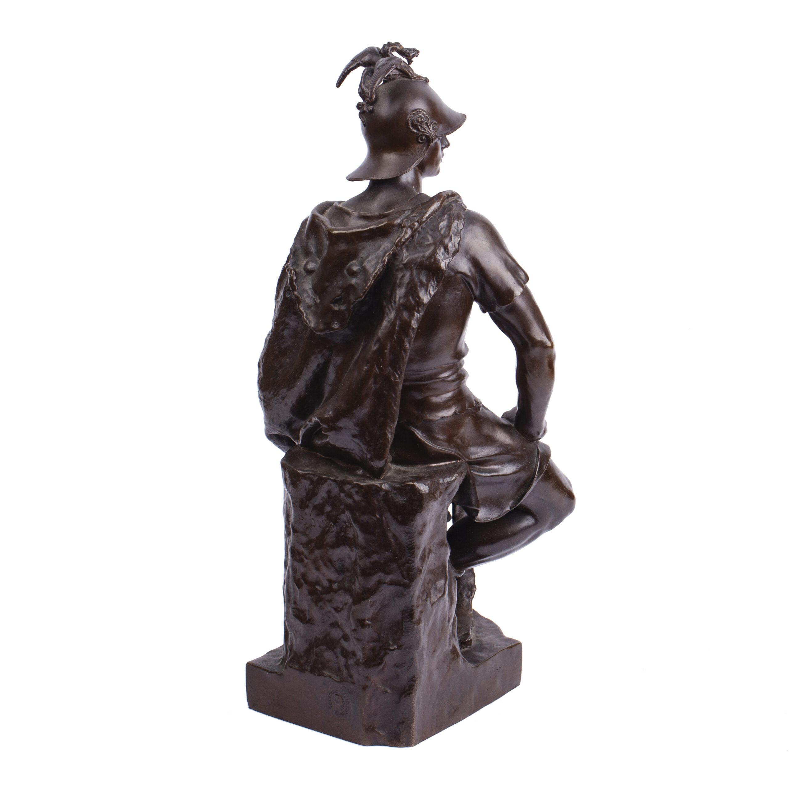 Depicted as a seated Roman warrior, the figure embodies noble restraint and strength through a masterful synthesis of naturalism and classical idealization. The serene dignity of the soldier’s pose and the finely rendered drapery are hallmarks of Dubois’s distinctive “Neo-Florentine” style, blending Renaissance influence with French academic sculpture of the 19th century.