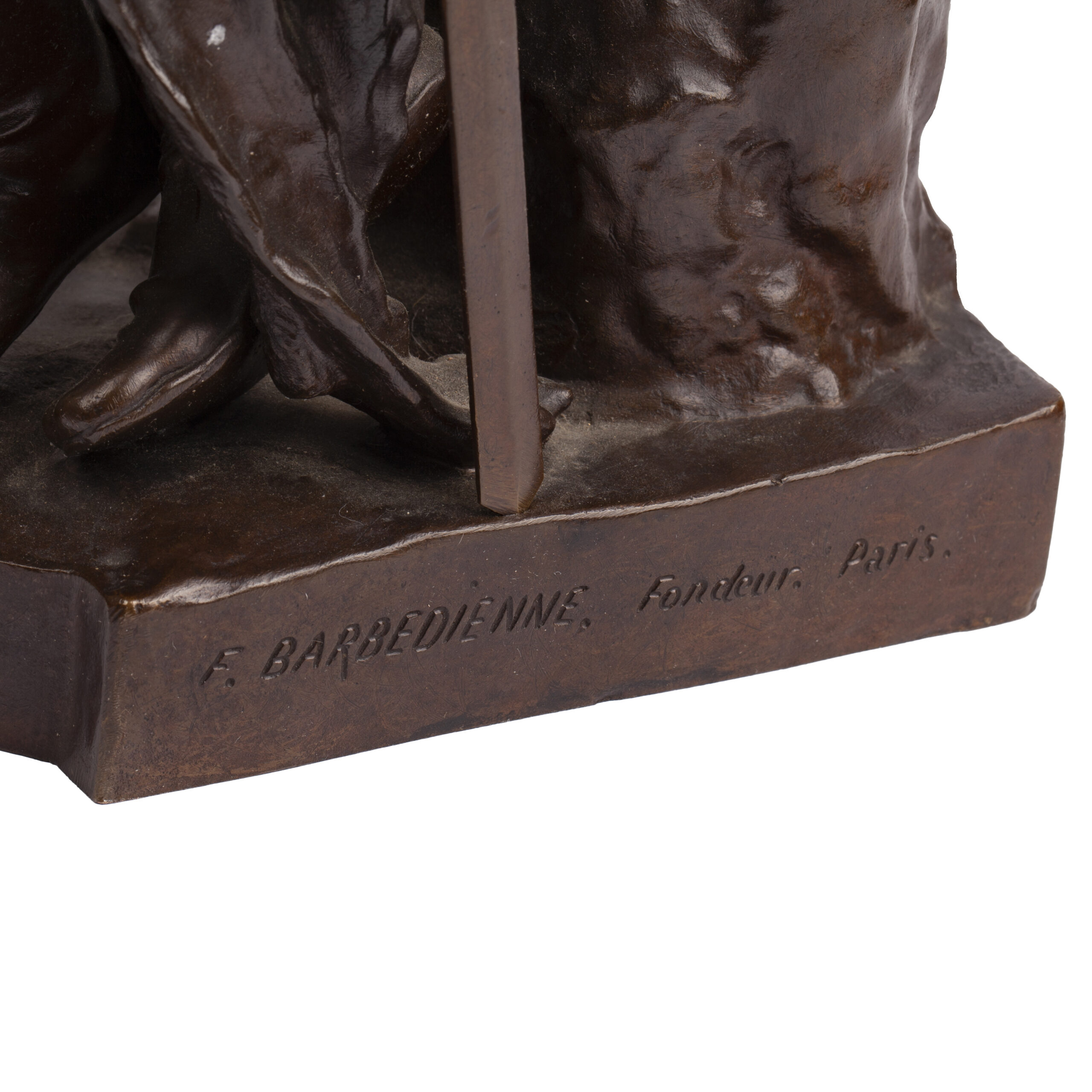 Created by Alfred Caravanniez, a French sculptor trained under Aimé Millet at the École des Arts Décoratifs in Paris, the work exemplifies the historical realism and patriotic romanticism characteristic of late 19th-century French bronze statuary. Cast by the renowned Barbedienne Foundry, it reflects the superior quality and finish that made the firm one of the most respected bronze ateliers of its time.